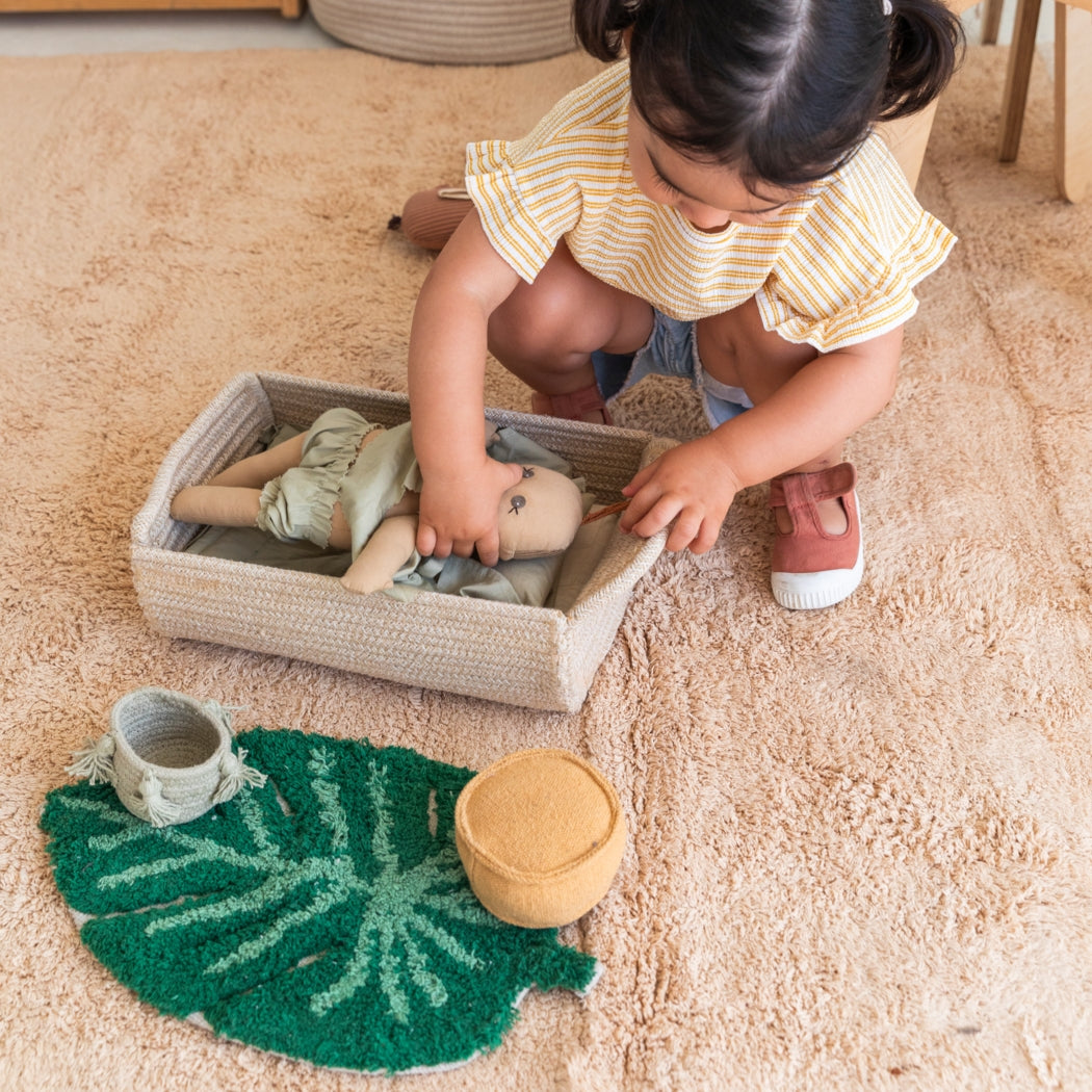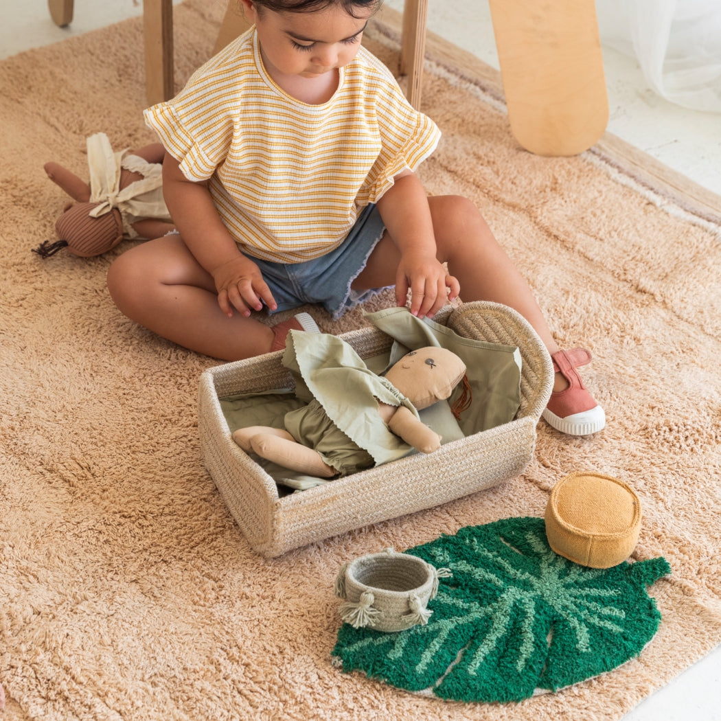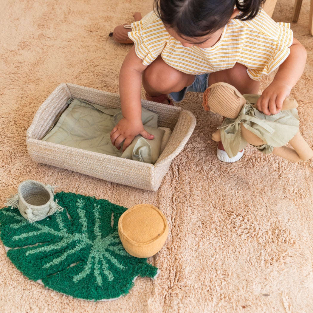 A textile toy set including a soft doll, a crib with bedlinen and matching decoration consisting of a rug, a pouf and a basket. The doll and the bedset is made using GOTS certified soft cotton poplin, the cotton mattress is filled with RugCycled fibers, and the crib is made of braided cotton ropes mixed with fibers from recycled PET-bottles. The decoration articles are a tribute to the Lorena Canals bestselling designs Monstera rug, Tassels basket and Chill pouf. Comes packed in a recycled cardboard box shaped as a house, with a practical multicolor cord as a handle.
