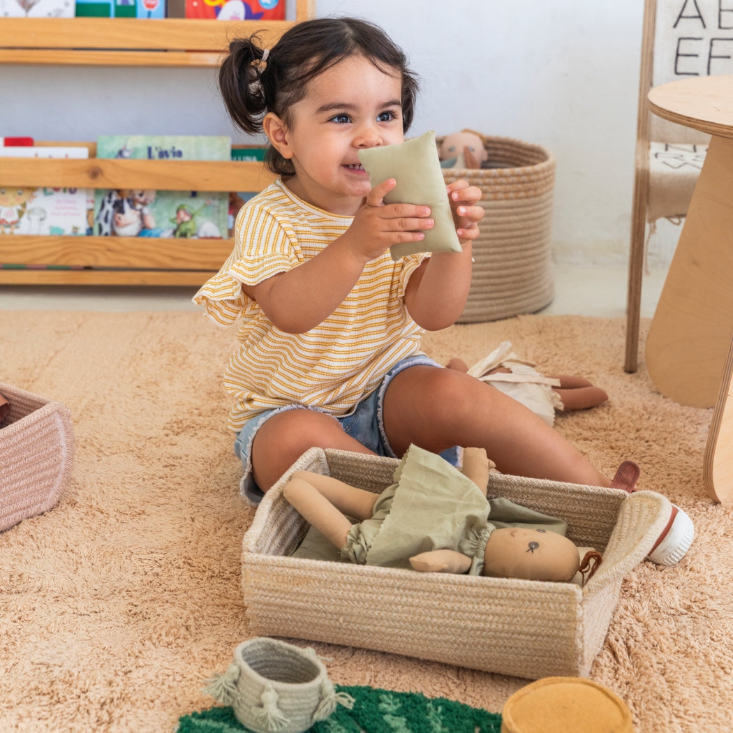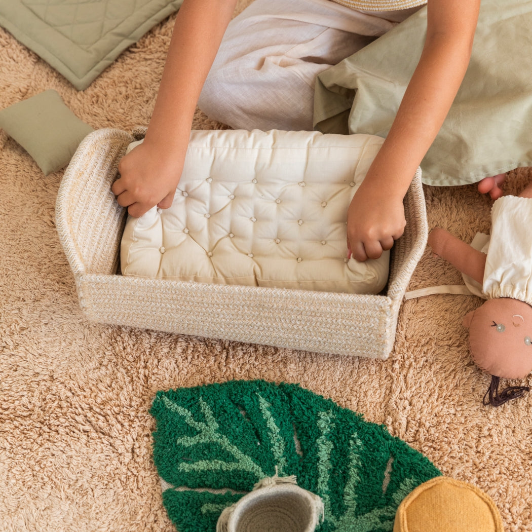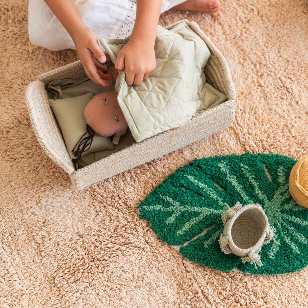 A textile toy set including a soft doll, a crib with bedlinen and matching decoration consisting of a rug, a pouf and a basket. The doll and the bedset is made using GOTS certified soft cotton poplin, the cotton mattress is filled with RugCycled fibers, and the crib is made of braided cotton ropes mixed with fibers from recycled PET-bottles. The decoration articles are a tribute to the Lorena Canals bestselling designs Monstera rug, Tassels basket and Chill pouf. Comes packed in a recycled cardboard box shaped as a house, with a practical multicolor cord as a handle.