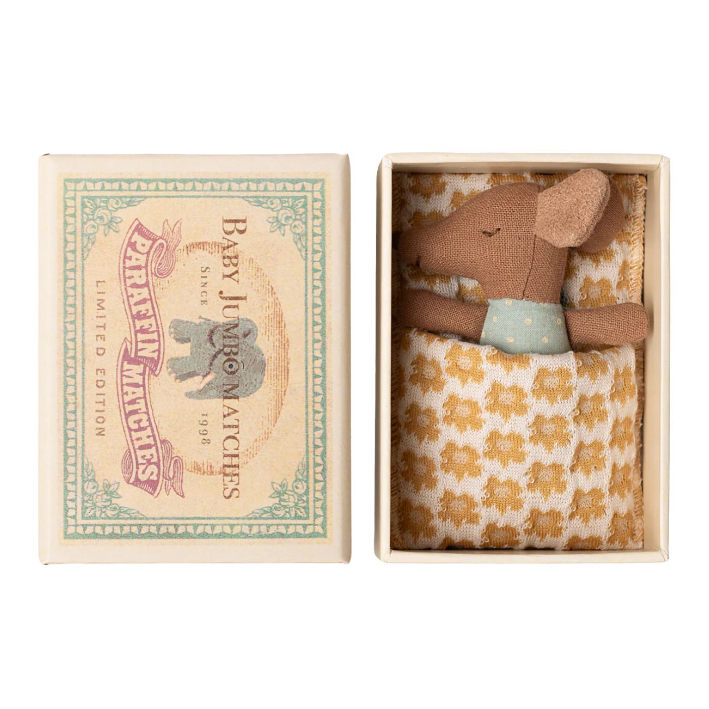 A classic Maileg item. This mouse is ready for hours of play and sleeps tight in the little matchbox. The clothes and bedlinen are made of soft fabrics with unique prints in beautiful colors.