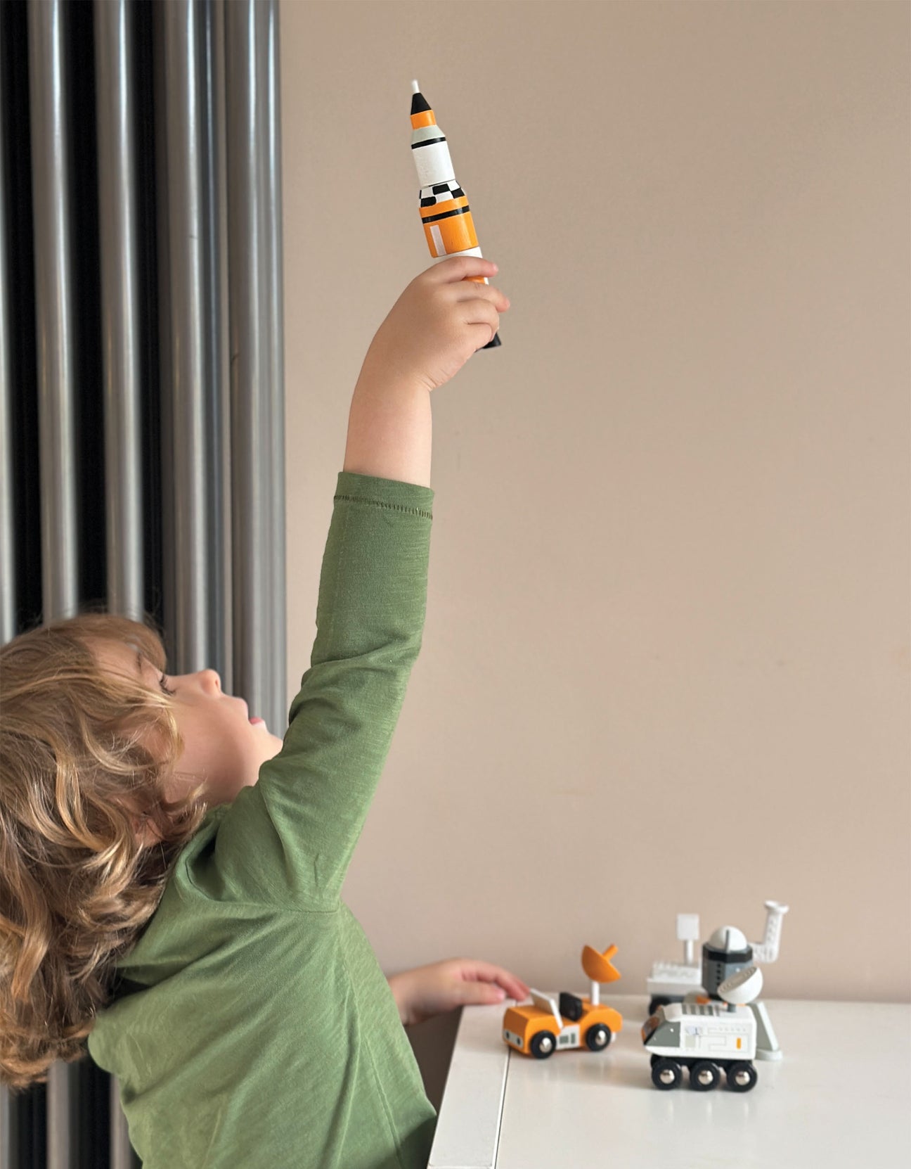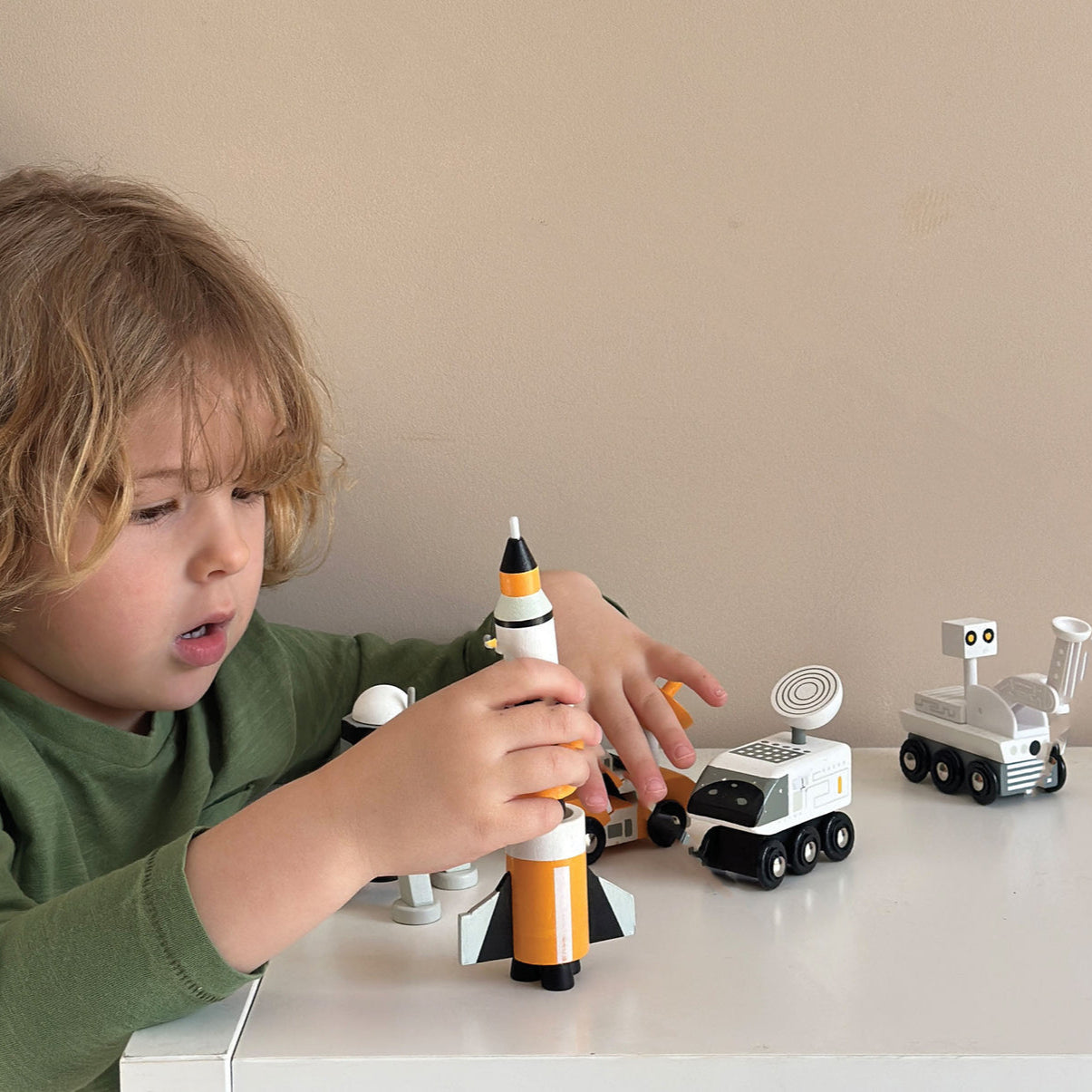 Solid wood space vehicles for inter-galactic adventures, set includes: a 3-part rocket, a moon landing capsule, a lunar roving vehicle, a launch crew rover, and a lunar probe.