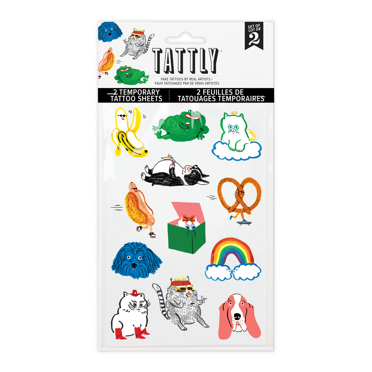 The gang’s all here! They've got pretzels on skateboards, a Boston Terrier eating pie, a cat in cowboy boots, and many other quirky critters! You're sure to love Kristina Micotti’s cast of characters on Tattly's Goofy Chums Tattoo Sheet.