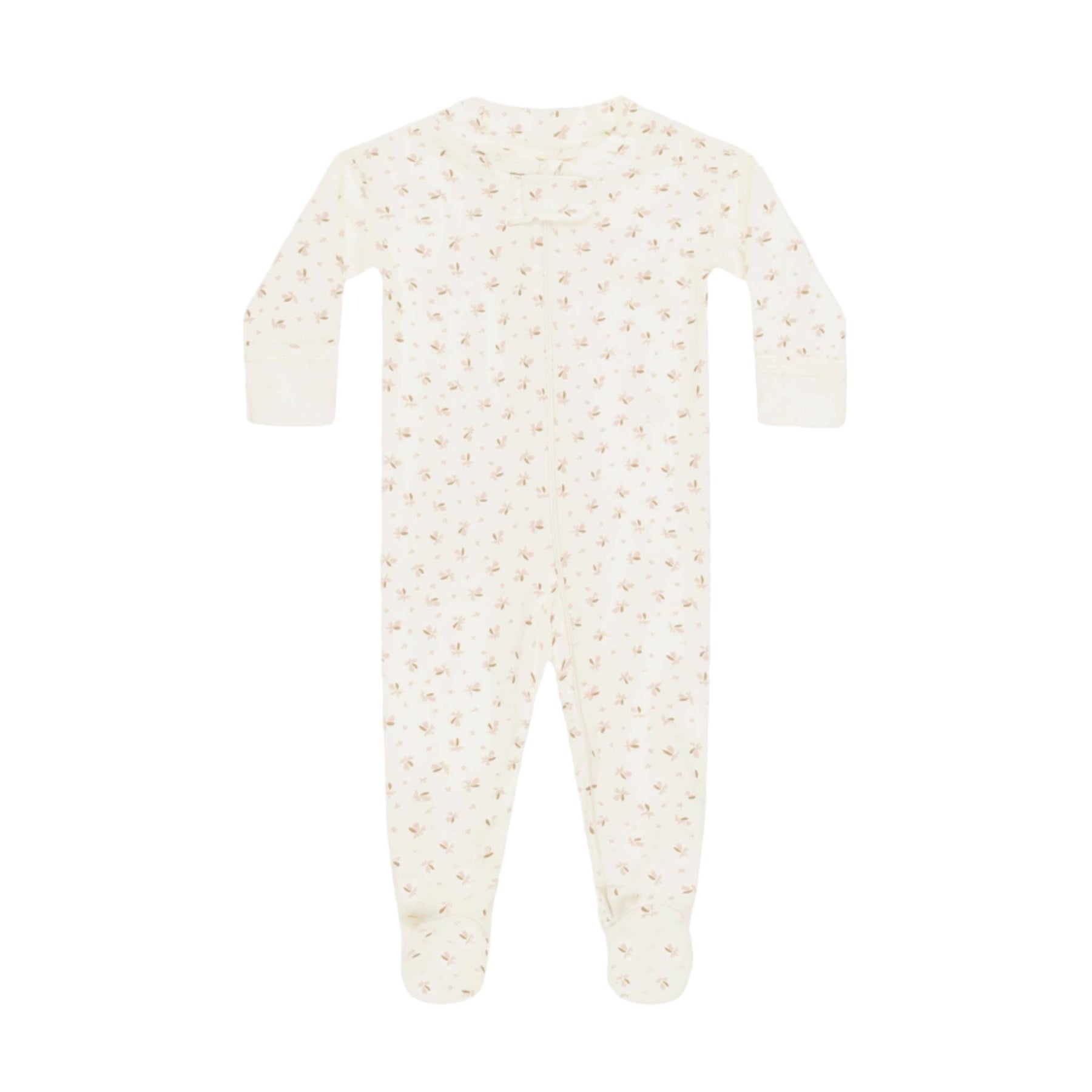 Quincy Mae's cozy Footie Sleeper, made from soft organic cotton jersey, features a two-way zipper for easy changes with fold-over mitts included in sizes PR - 3-6M to prevent scratches and keep little hands warm, and rubber dots for on the soles of sizes 6-12M - 12-18M for your little walkers.