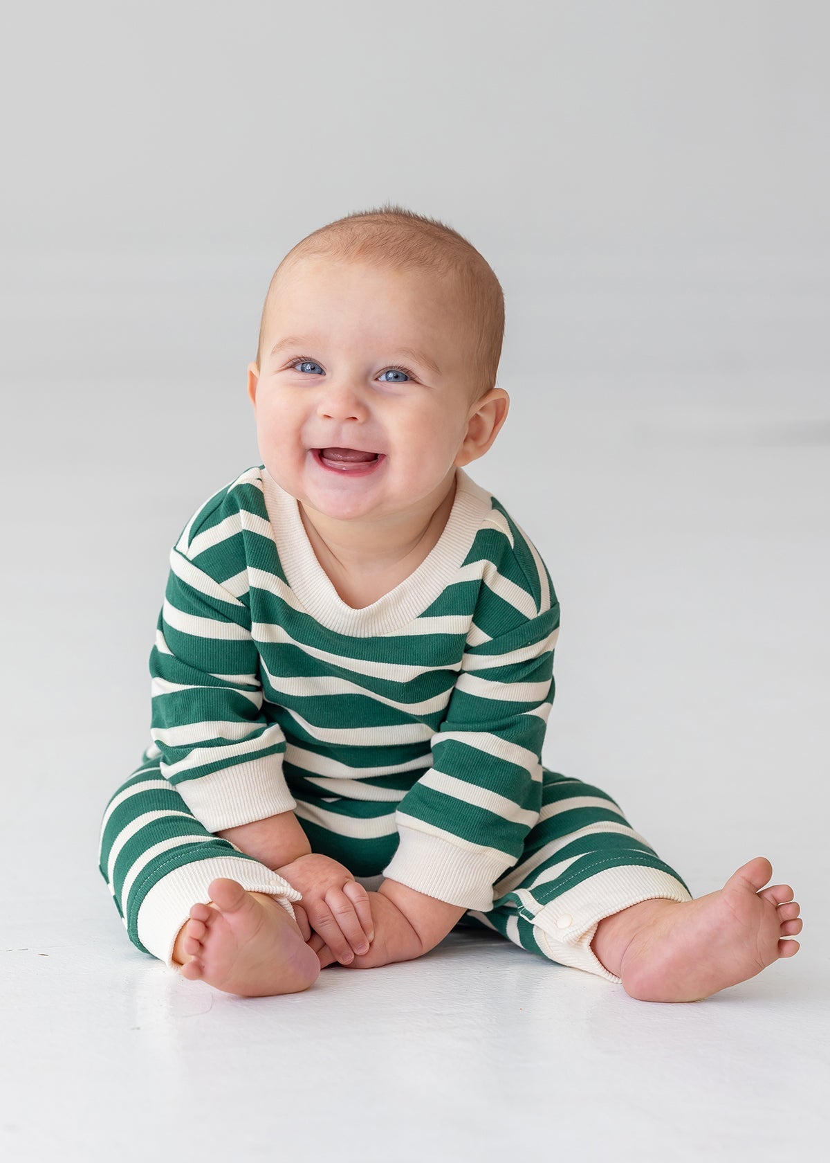 The Jackson Romper combines style and everyday comfort. Featuring bold green and white horizontal stripes, this long-sleeve romper is accented with white cuffs and a matching collar for a polished look. Perfect for playtime, outings, or lounging, its an instant wardrobe classic.