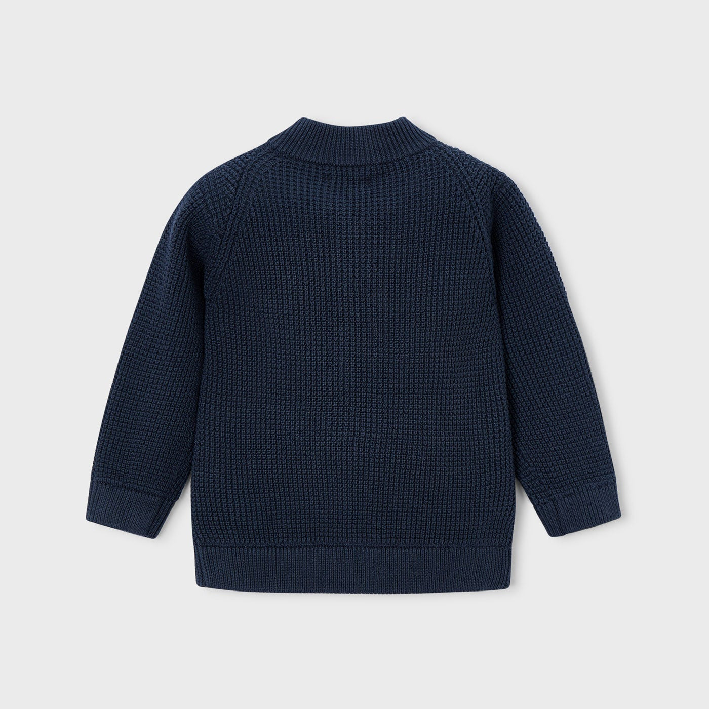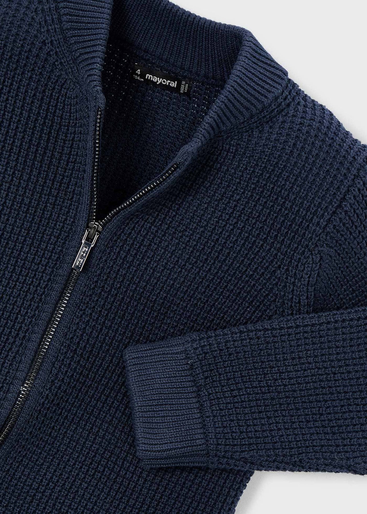 Long sleeved Woven knit jacket for boys. Bomber style neckline. Front, central zip fastening. Knitted fabric, soft and pleasant to the touch. Front pockets.