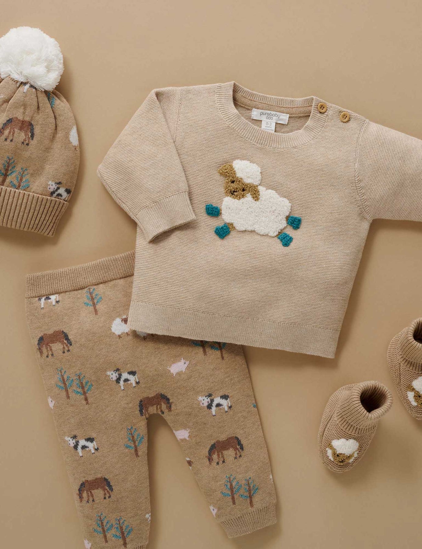 Purebaby's On the Farm Jumper is cosy and soft, perfect for the cooler months. Featuring a sweet, fluffy farm animal applique on the front and ribbed trims to keep out chills. Made from an organic cotton wool blend yarn, this warm piece looks cute paired with the On the Farm Leggings and Beanie.