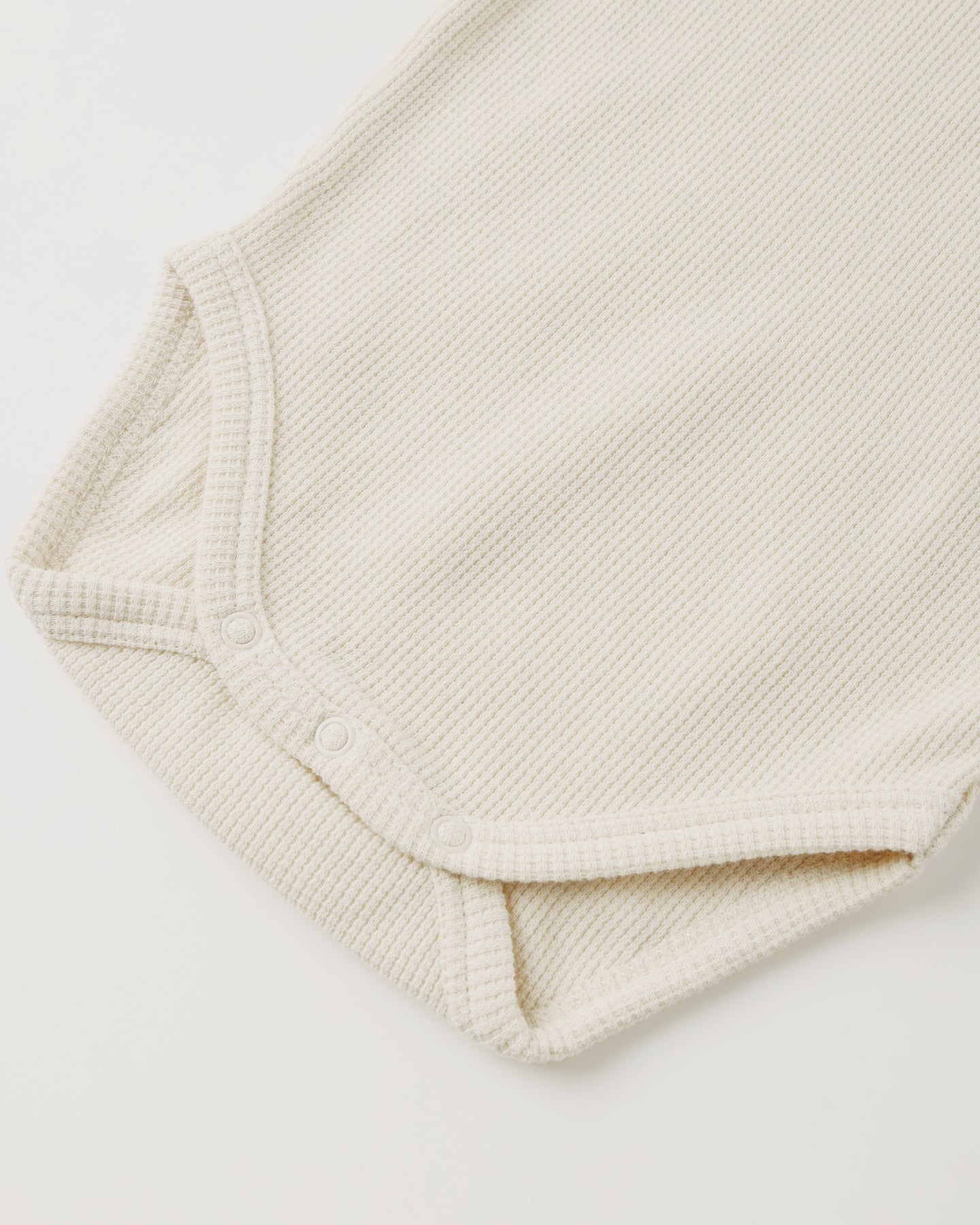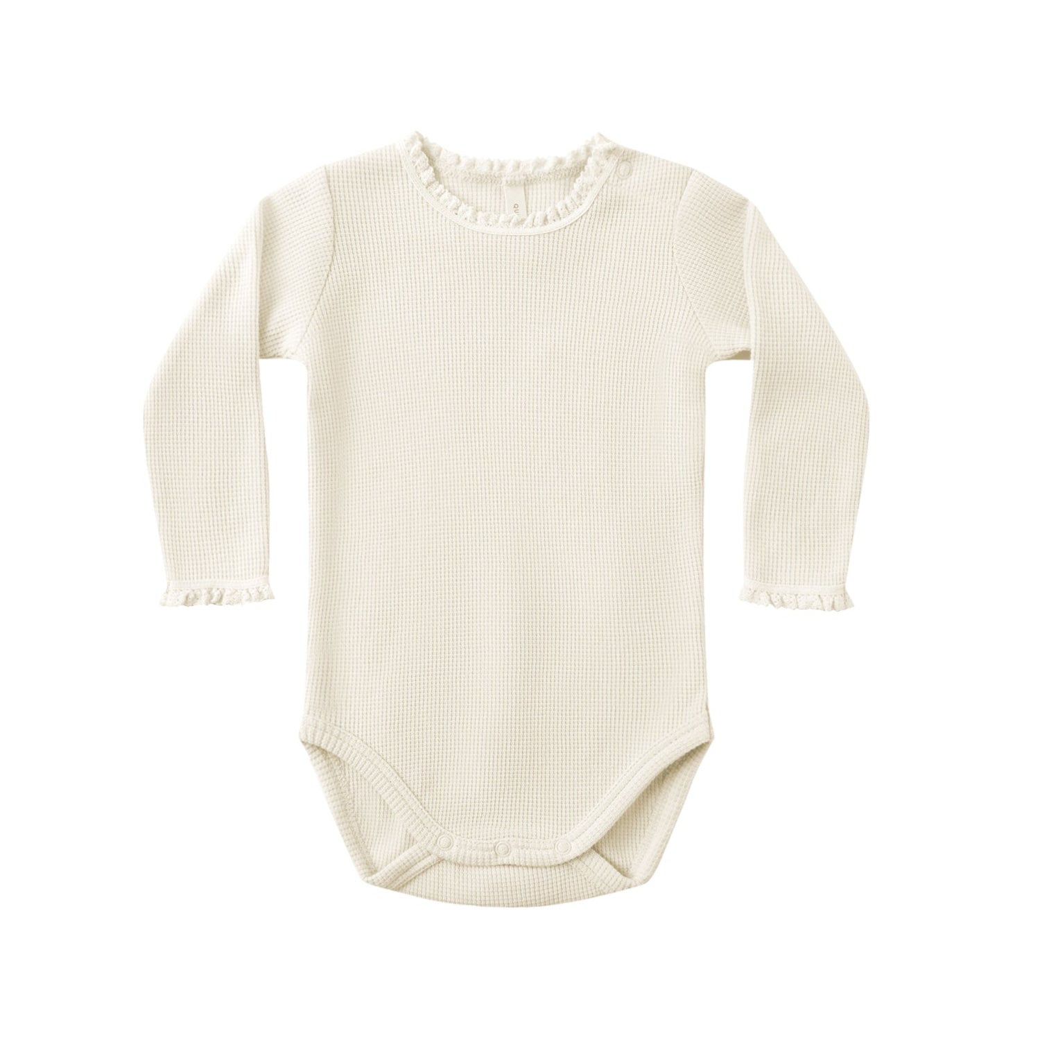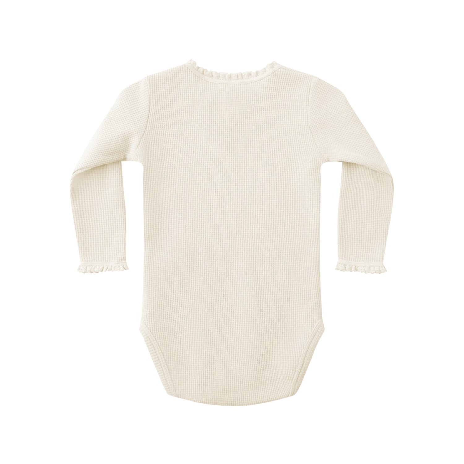 Long sleeve onesie in Quincy Mae's lightweight waffle knit, featuring the sweetest crochet lace ruffle detail. Designed with shoulder and bottom snaps for easy changes.