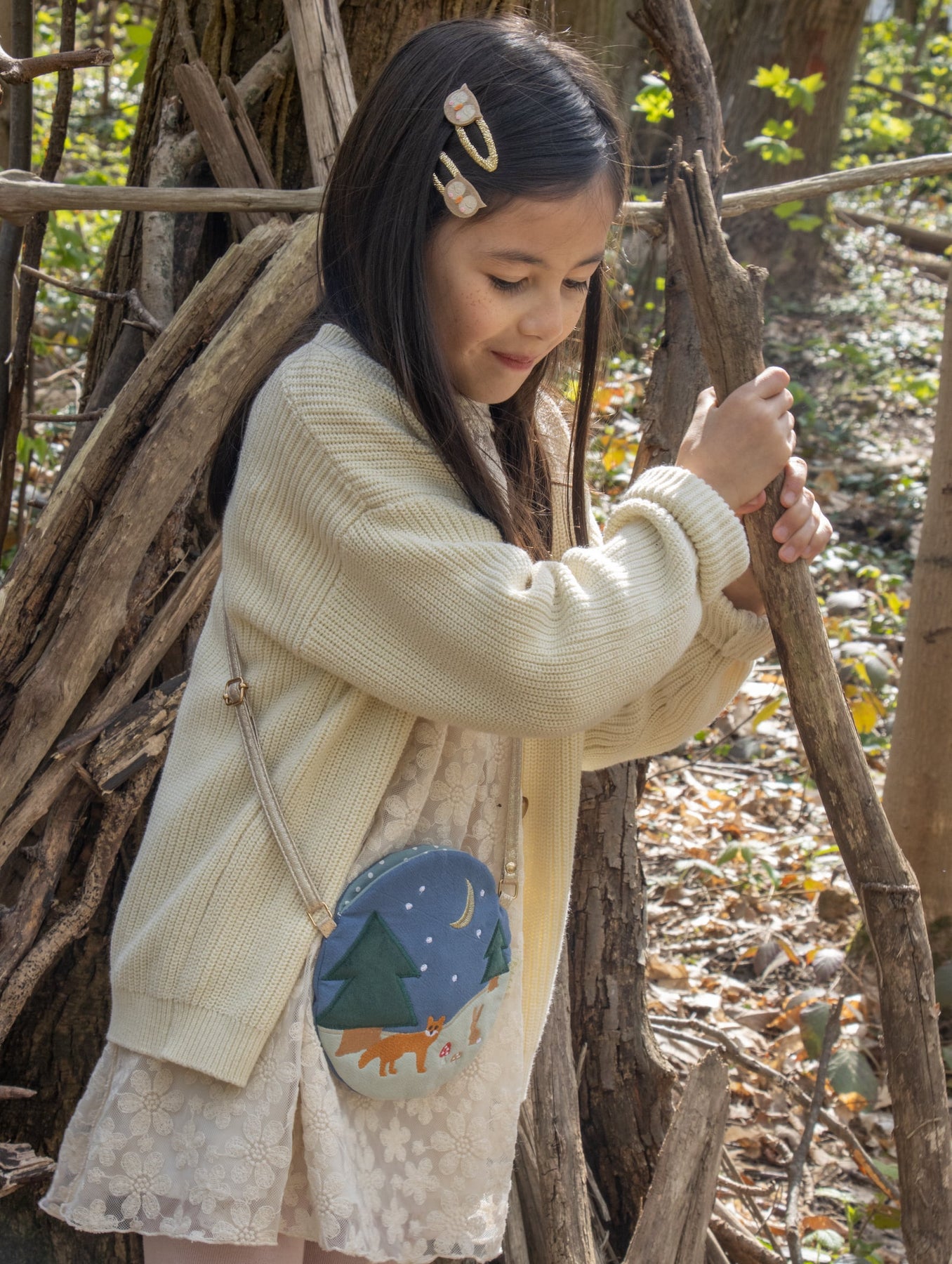 Take a wander under the starry skies with the Rockahula Kids forest friends cross-body bag. Featuring beautiful embroidered woodland animals and soft velvet trees, this bag is perfect for little nature lovers! With a magnetic dot closure, spotty lining, and an adjustable gold strap with a breakpoint for safety.