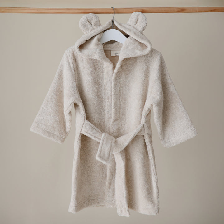 Fluffy bear‑cuddle vibes — the Mushie Organic Cotton Bear Robe – Fog wraps your little one in soft, absorbent organic cotton that feels like a warm hug after bath time.