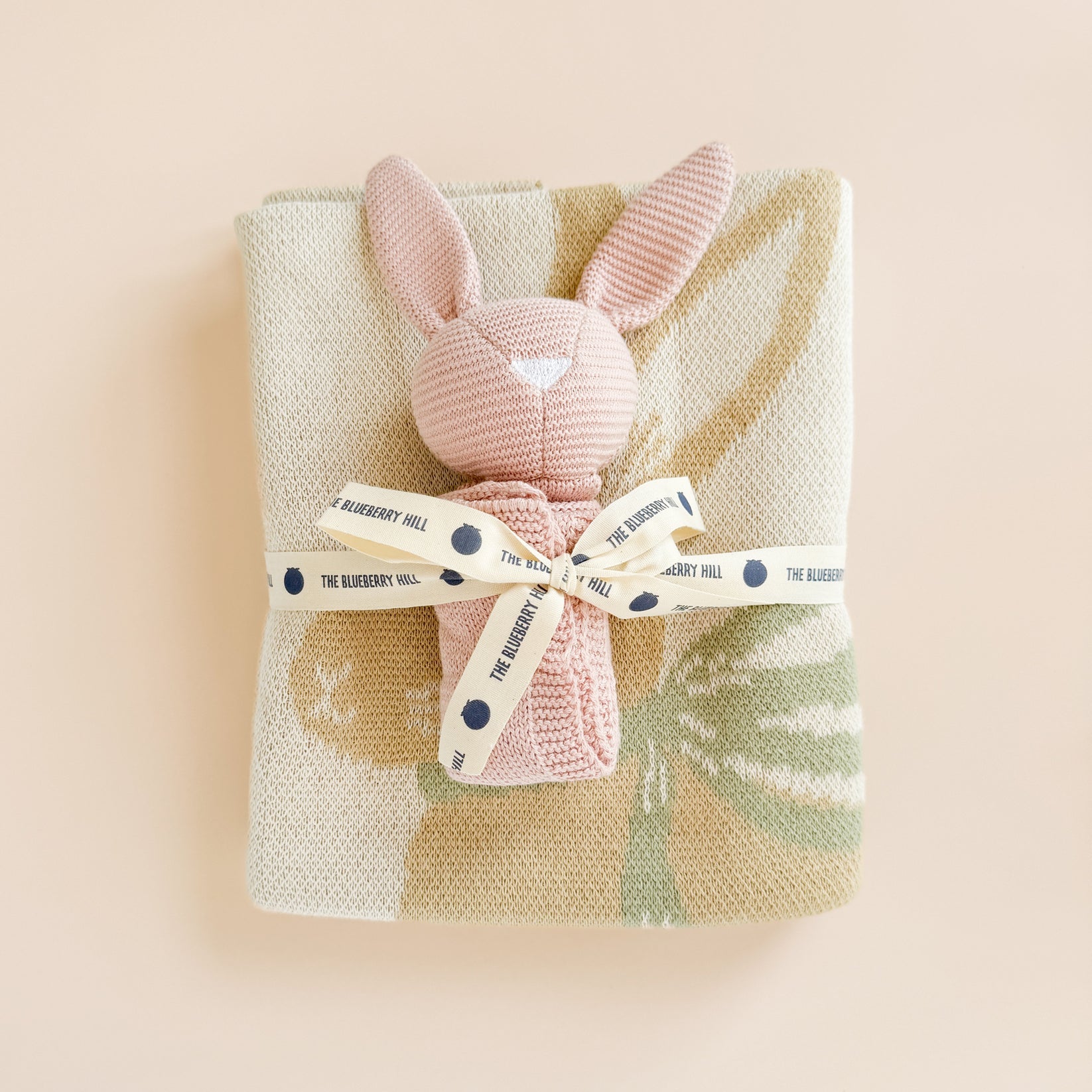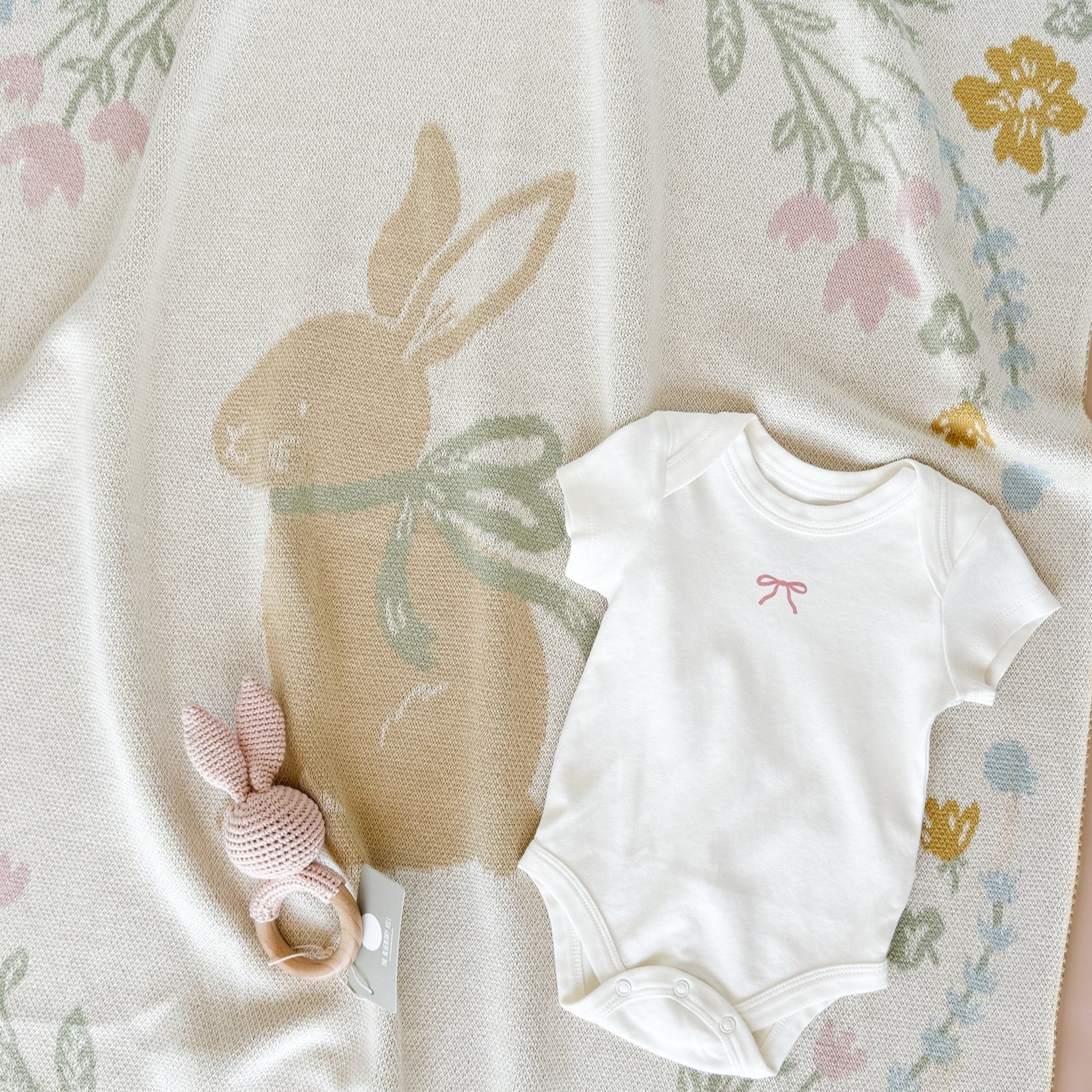 This organic cotton floral blanket centers around a sweet bunny with a bow. Snuggle in it. Decorate with it. Get the matching bunny lovey, baby rattles, or greeting card to complete the gift set.
