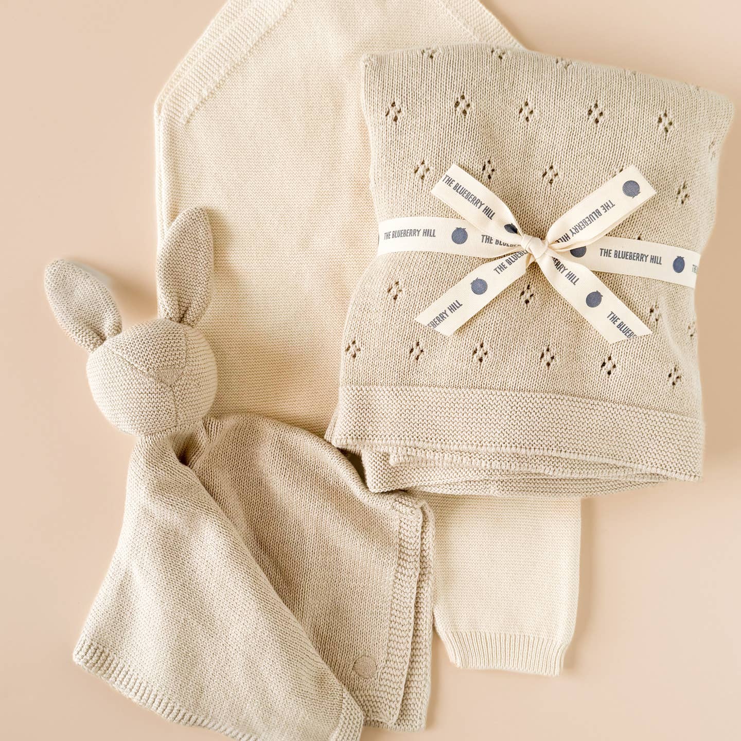 Knit from 100% Organic Cotton, The Blueberry Hill's pique baby blanket is the perfect gift for a new parent. Add a soft touch of luxury to nurseries, strollers and car seats. Available in other colors. Perfect for Embroidery Blanks and Personalization.