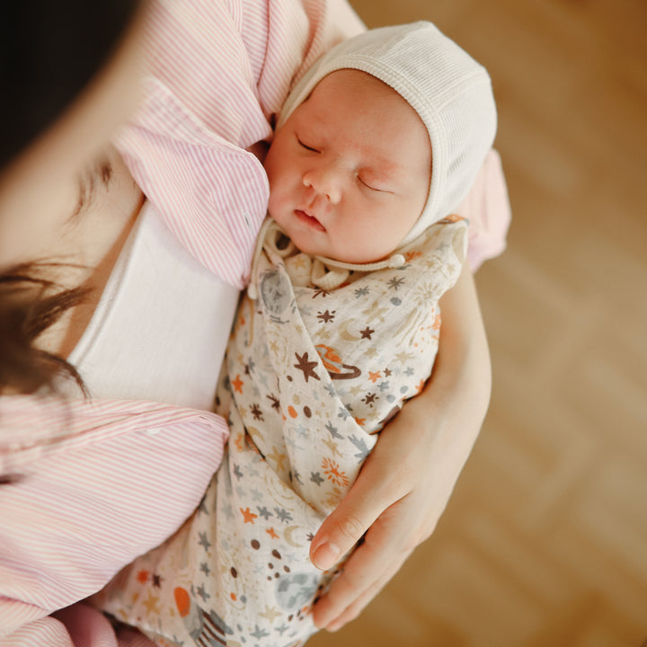 Nap time just got so much more cozy with the Mushie muslin baby swaddle - ideal for swaddling, nursing, and cuddling your baby.