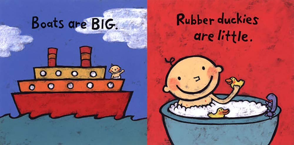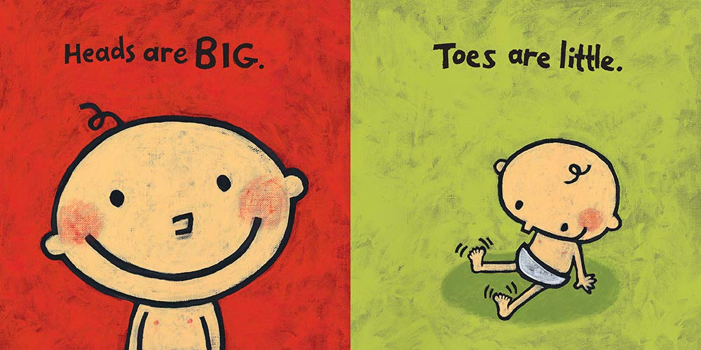 Ladies are big, but ladybugs are little. Amiably illustrated in a bright, graphic style, Leslie Patricelli’s spirited board book, Big Little, stars an obliging, bald, and very expressive toddler who acts out each pair of opposites with comically dramatic effect.