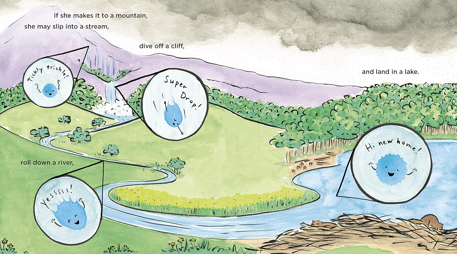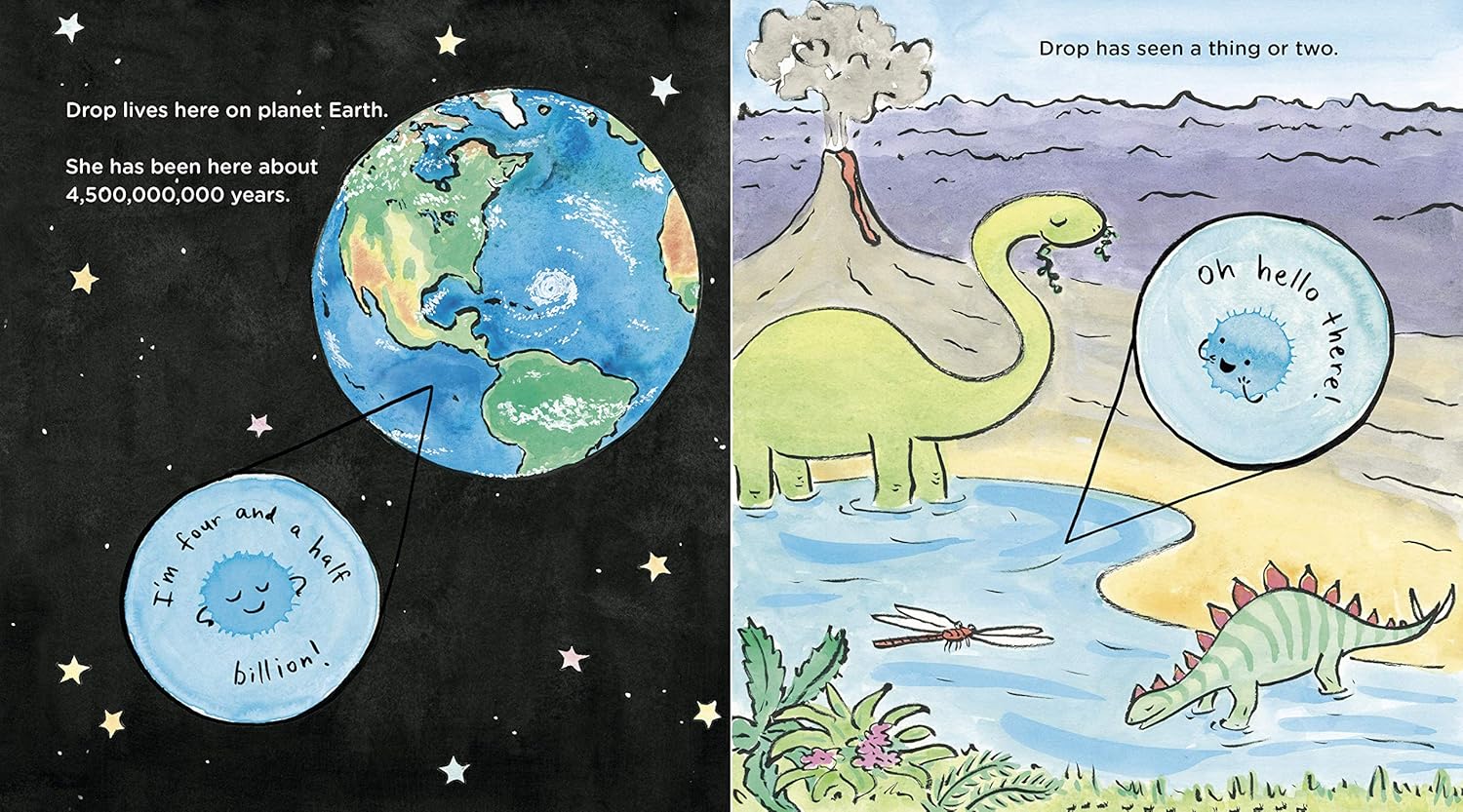 Meet Drop. She's water! And she's seen a thing or two. Yep, even dinosaurs; she's four and a half billion years old, after all. Everywhere Drop flows and she flows everywhere, she keeps things moving, making life on earth possible, and having a great time doing it. (Have you ever plummeted from a rain cloud? Or took a thousand-year nap in a glacier? Drop knows how to live right.) With delightful panache and a steady stream of funny one-liners, Drop takes readers on an adventure through the water cycle and beyond. Filled with irresistible artwork, funny asides, and a steady sprinkle of kid-enticing facts, Drop is the story about water you never knew you were thirsting for.