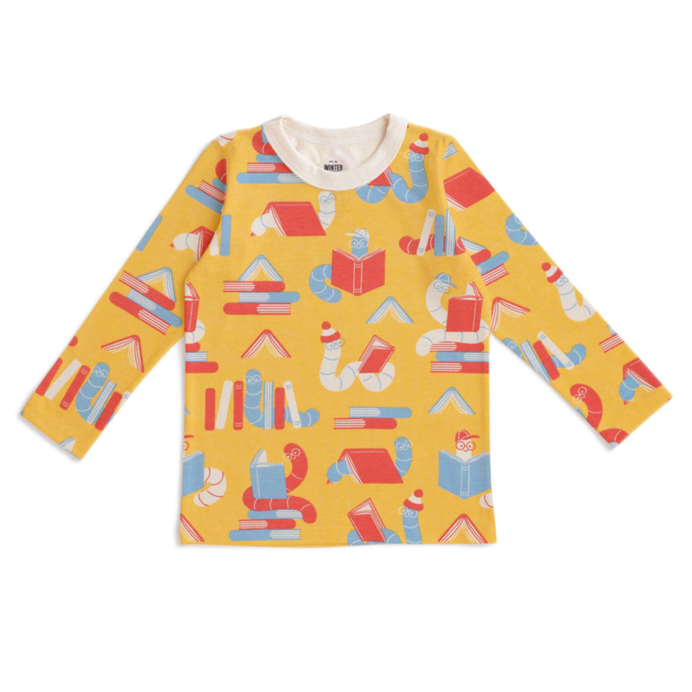 Their new favorite T-shirt, Winter Water Factory's Bookworms print. Curious little bookworms reading and cozying up with their favorite stories.