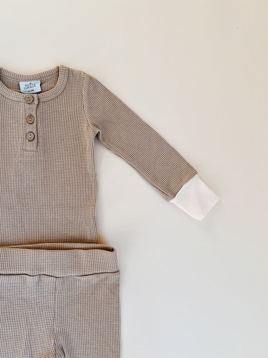 A comfy, soft henley shirt and pants set in a waffle knit fabric. Features extended arm and leg cuffs in cream.