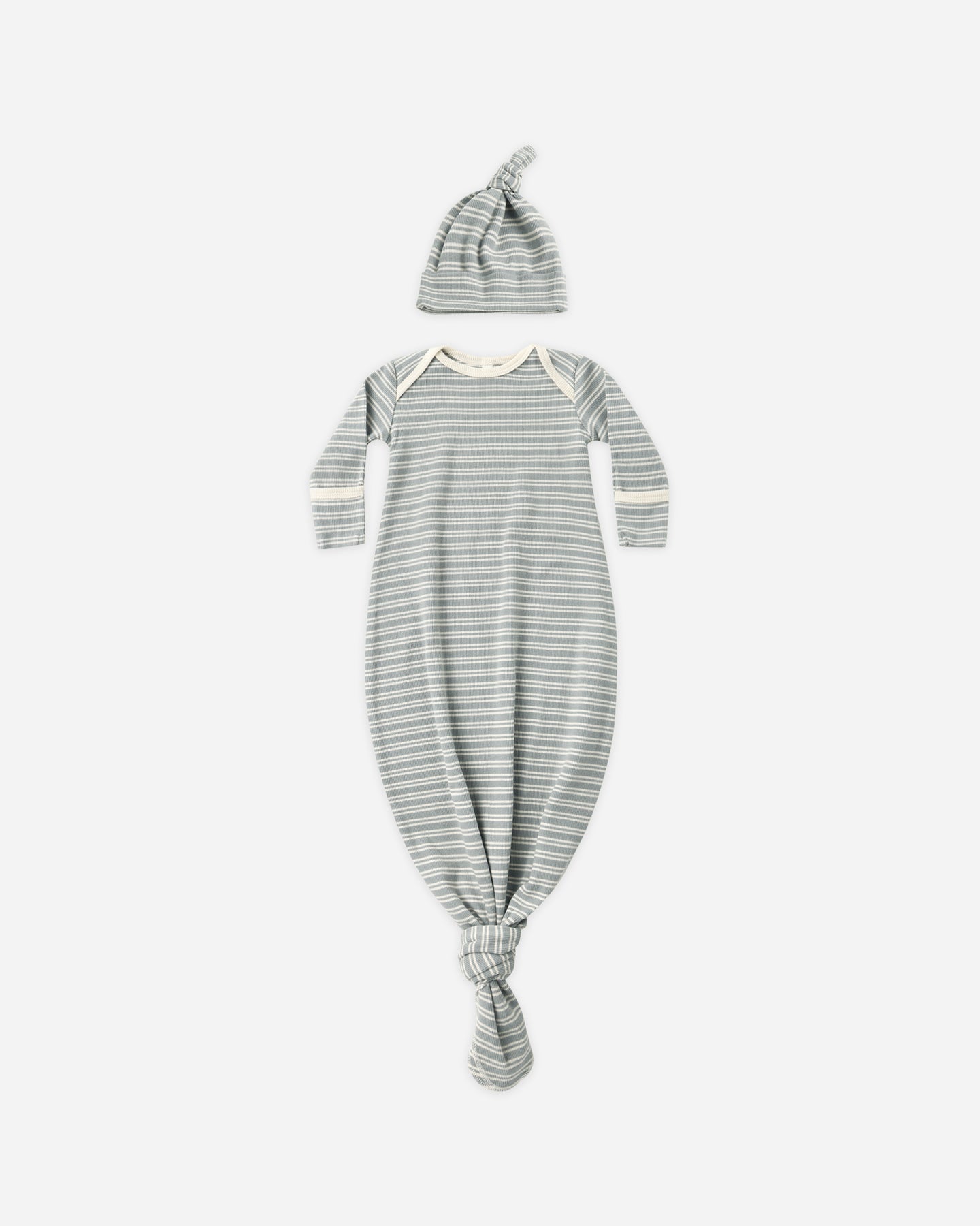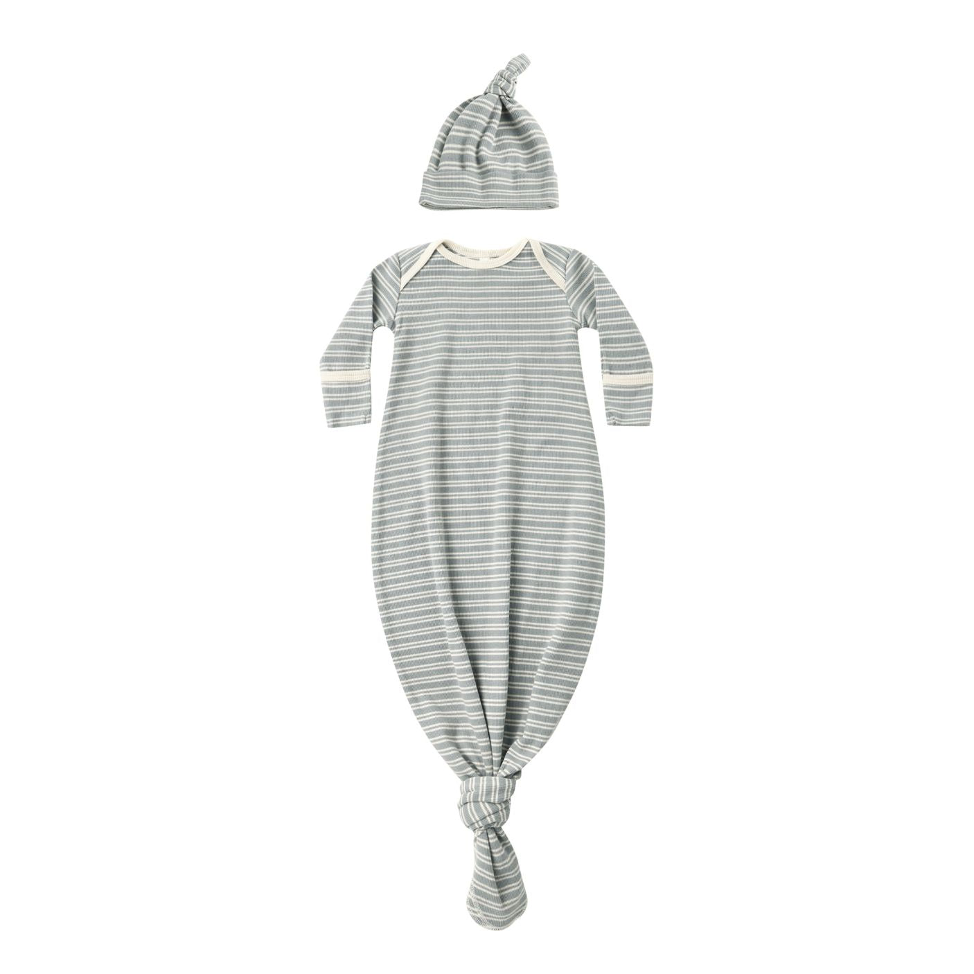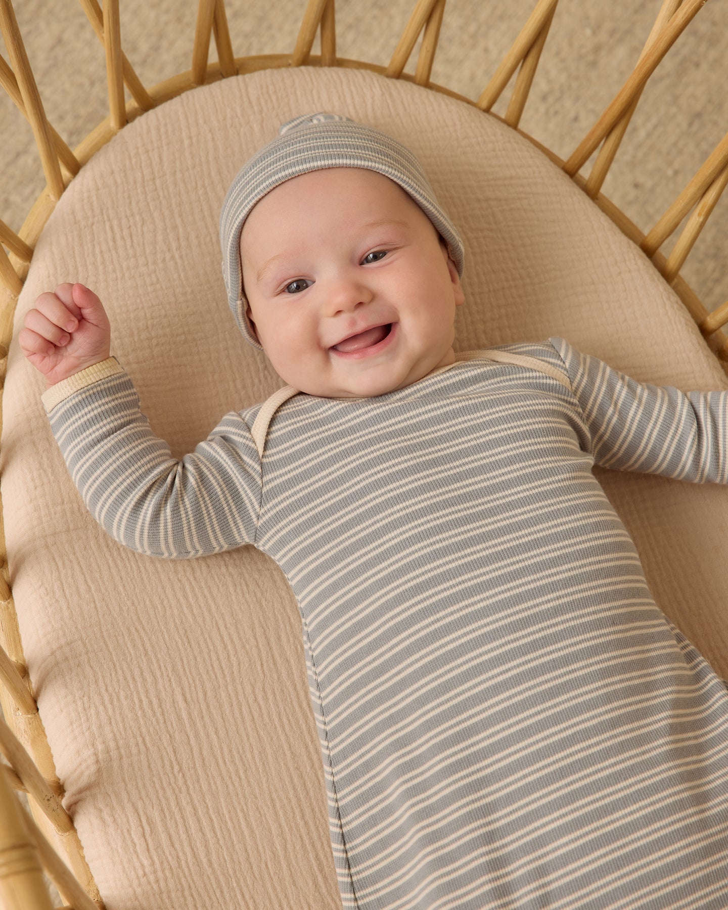 This Quincy Mae knotted baby gown is designed with lap sleeves and fold-over hand mitts to keep baby snug, paired with a matching knotted hat—all crafted from soft, stretchy rib knit.
