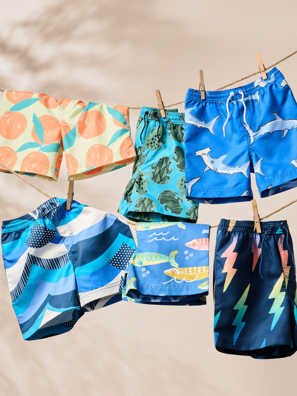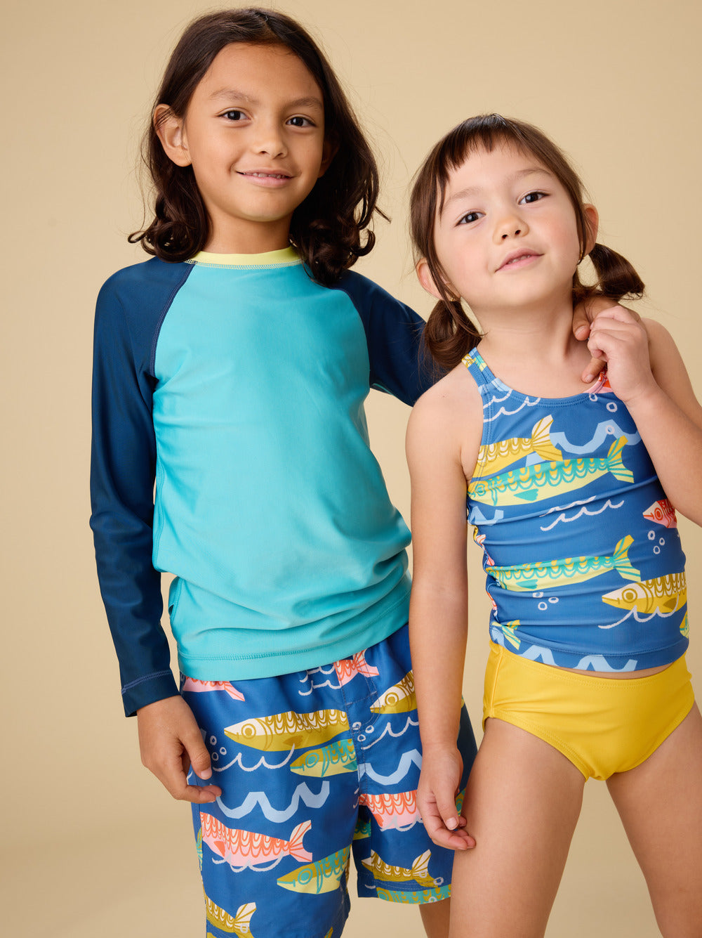 Designed for long days in and out of the water, these Mid-Length Swim Trunks balance comfort, coverage, and easy movement. The easy-fit silhouette hits just below the mid-thigh, with an elastic waist and fully functional drawcord for a secure, adjustable fit. Thoughtfully made with UPF 50+ sun protection and crafted from 100% recycled fabric, they're built to keep up with swimming, playing, and everything in between. Finished with a soft mesh liner and a back patch pocket for everyday practicality. Pair with one of rash guards for extra sun protection during active swim days.