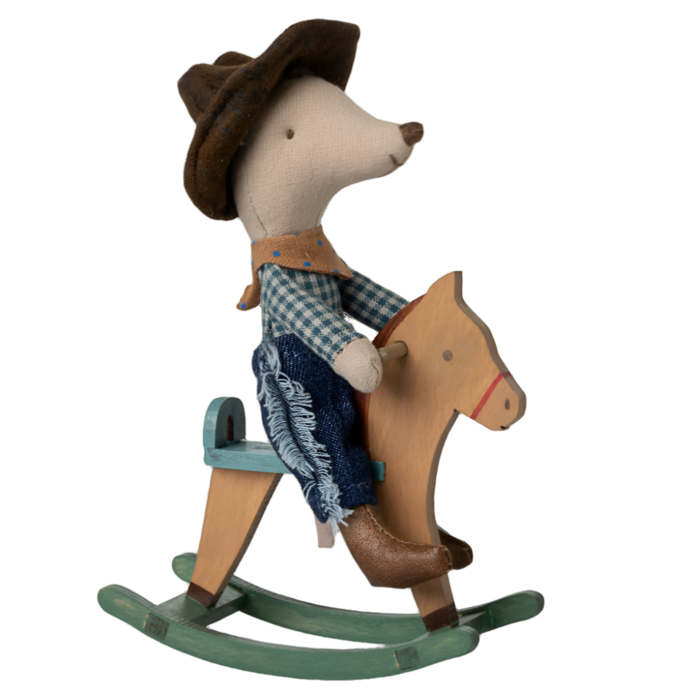 Saddle up for adventure! Cowboy Mouse is dressed in tiny blue jeans, a bandana, and a classic cowboy hat - ready to ride off on a rocking horse. This Maileg little friend is set for hours of play and endless journeys across the wild west.