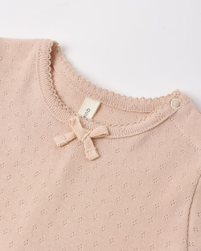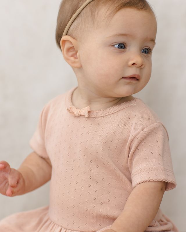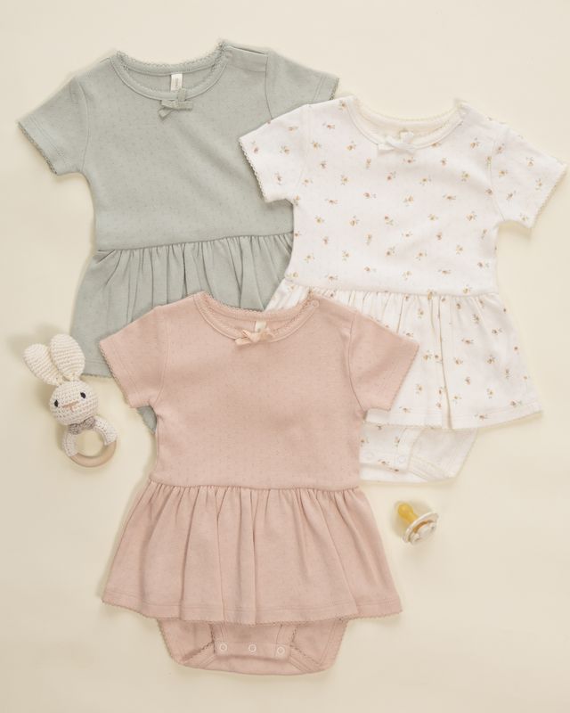 This short sleeve romper features a peplum skirt and sweet bow detail. Designed with shoulder and bottom snaps for easy changes.
