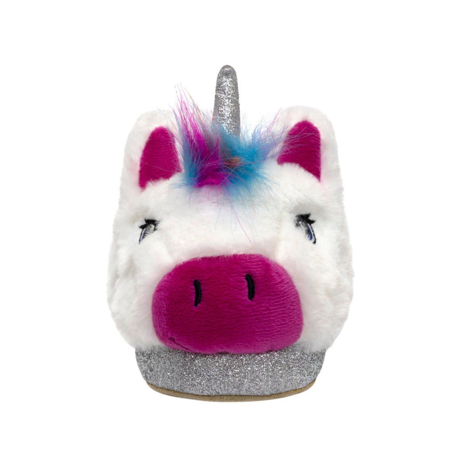 The Robeez Celestina Light-Up Slippers in White features plush faux fur unicorn motif with 3D ears-horn-tail, embroidered details, and lights. They're the perfect footwear choice for adventurous little ones!