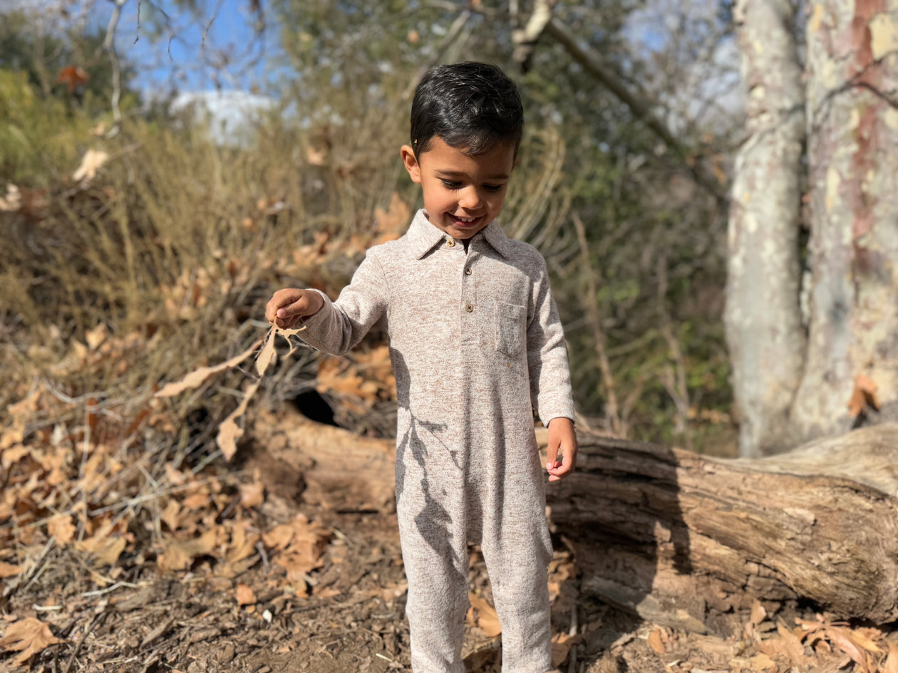 Wrap your little one in cozy charm with this heathered navy romper. Crafted from ultra-soft, breathable fabric, it’s perfect for all-day play or cuddles. The classic collared neckline, wooden button placket, and chest pocket add a touch of timeless style, while the full-length sleeves and legs keep them warm.