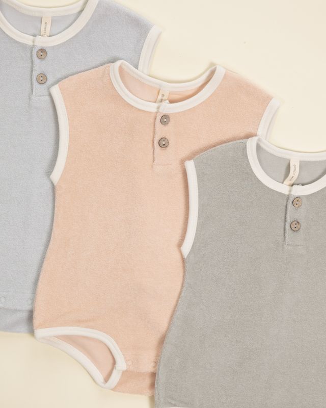 Quincy Mae's Terry Cloth Romper features ivory contrast binding, front placket with coconut buttons, and bottom snaps for easy changing.