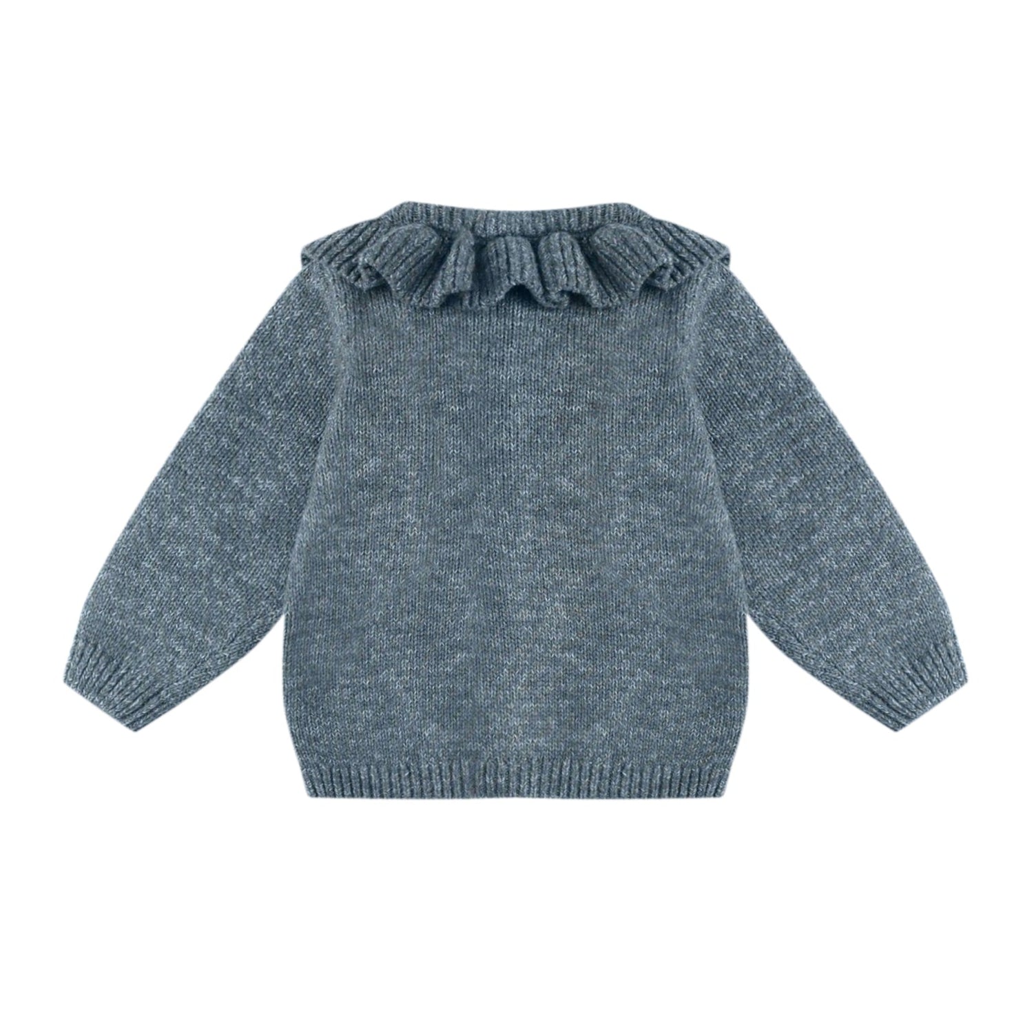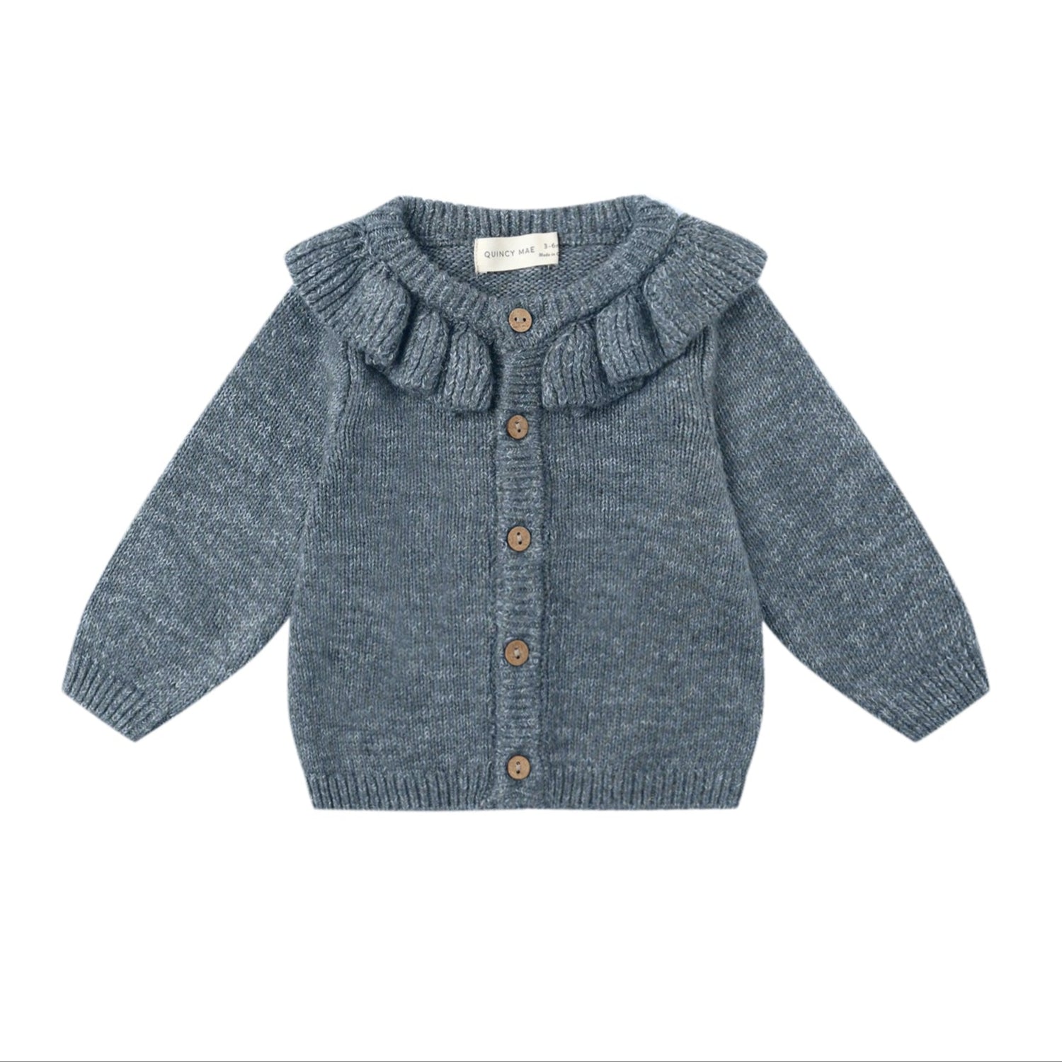 This sweet cardigan features a charming ruffle collar and coconut buttons, making it perfect for layering on fall and winter days.