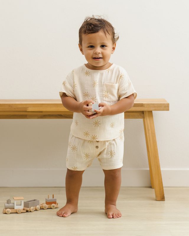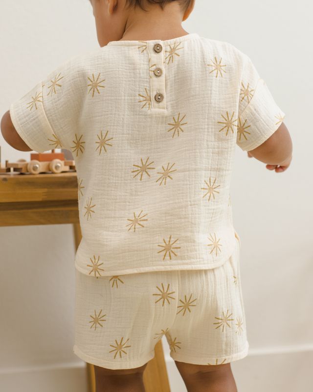 - Featuring 'sunburst' print on'natural' hue.