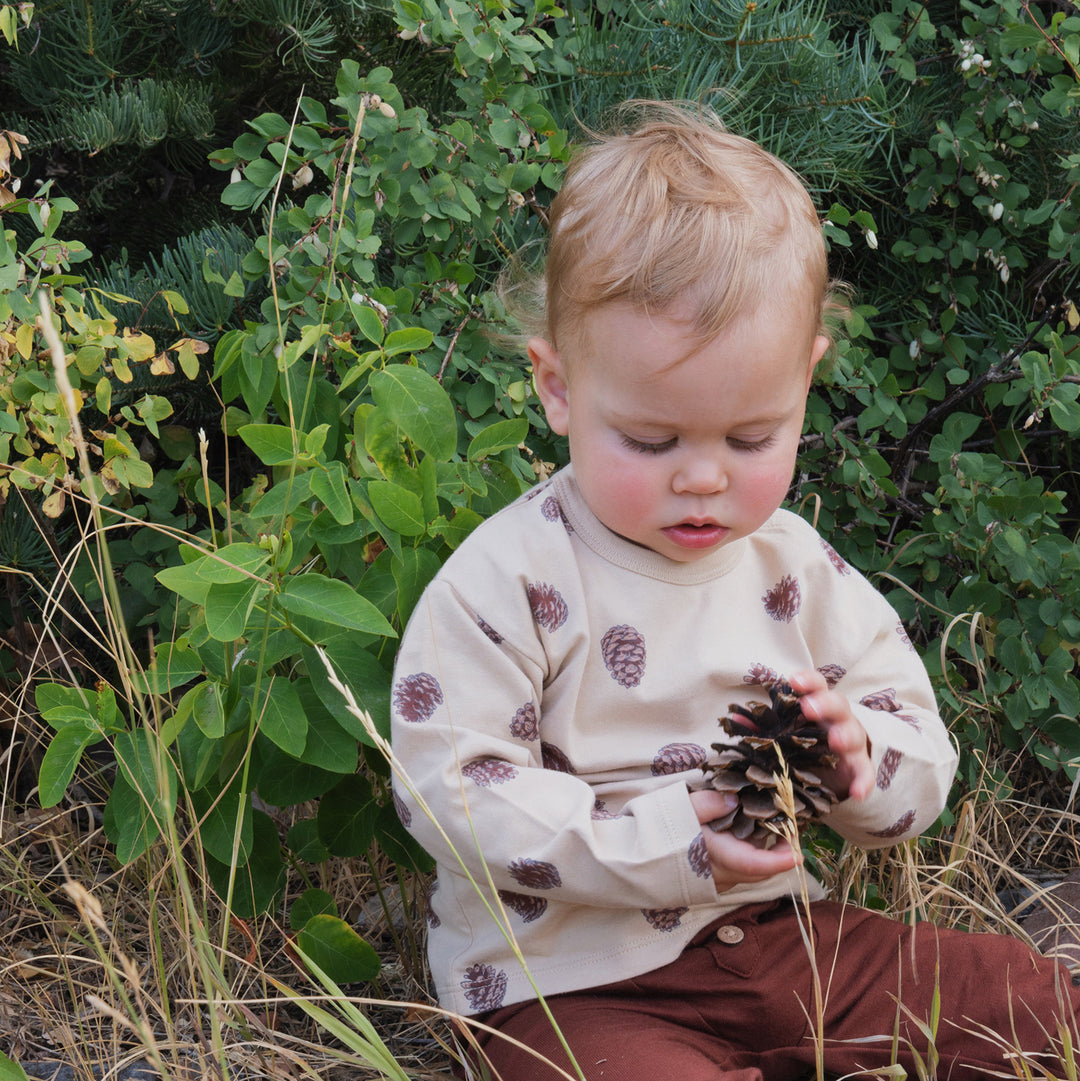 The City Mouse comfiest set for baby boy! The cutest top in pinecones print combed jersey and coordinating cinnamon pants for all his crawling and walking adventures. Made in Thailand.