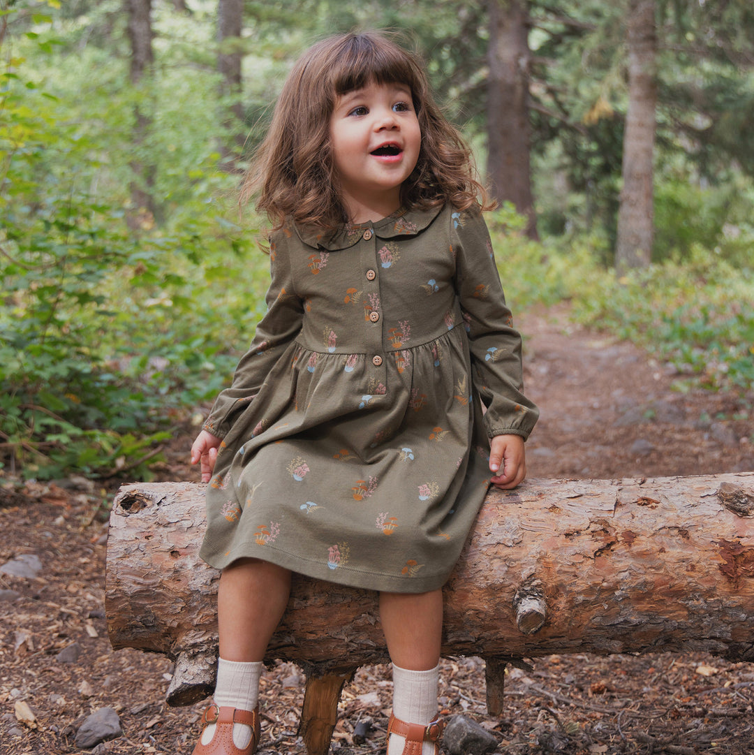 She'll be ready for fall celebrations in the City Mouse frill collar dress, made with the softest 100% combed cotton jersey. In their fall updated mushrooms print and henley front, it's perfect for anything fall brings.
