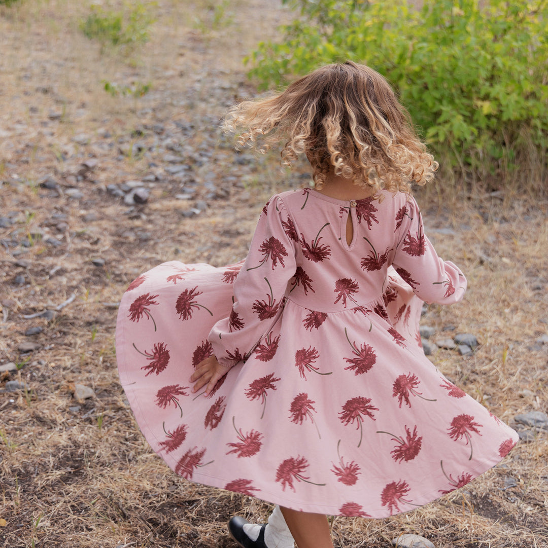 The City Mouse favorite twirl dress, made with the softest 100% combed cotton jersey. Featuring full sleeves, a soft elastic waist, and a flared bottom perfect for twirling. In their new favorite chrysanthemum print, this dress is perfect to twirl from fall to winter!