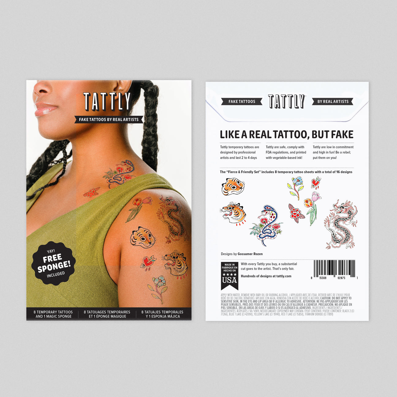 Each set includes 8 Tattoos—2 of each design—and comes packaged in a card stock sleeve with a full-color photo on the front. It also comes with a free Tattly sponge!