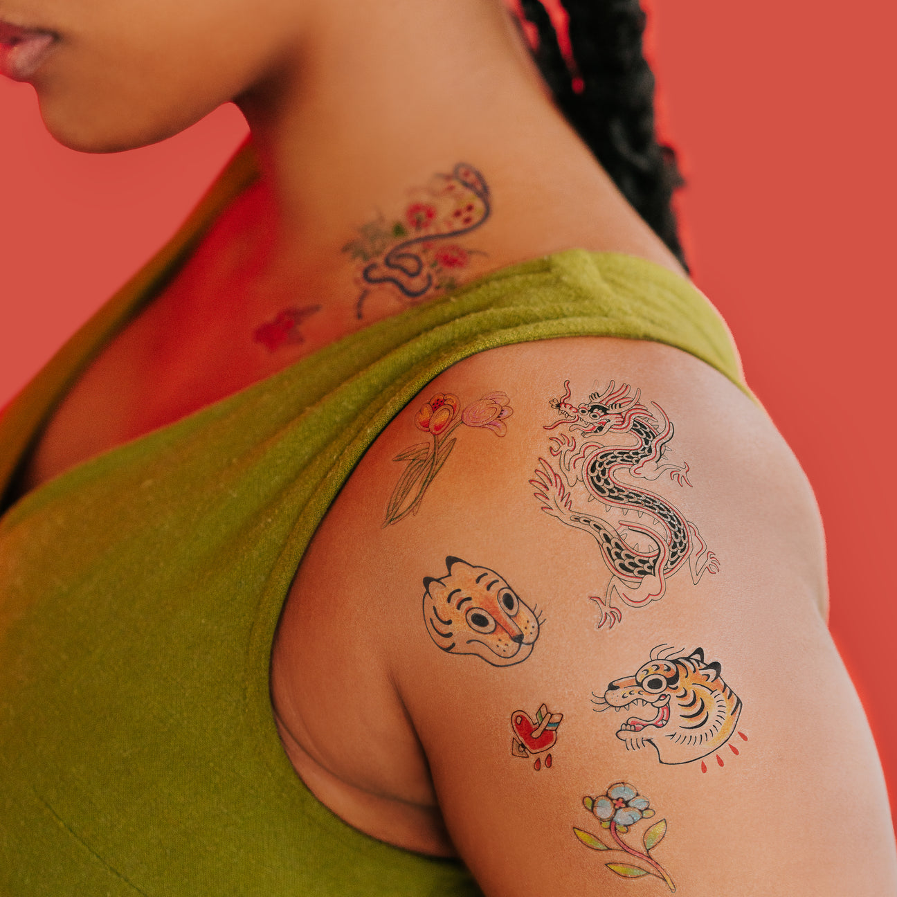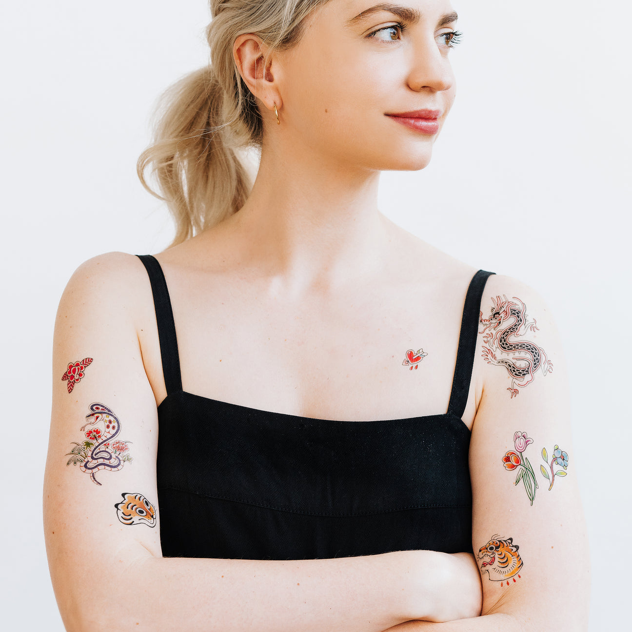 Sink your claws into the the Fierce & Friendly Tattoo Set designed by New York City-based tattoo artist, Gossamer Rozen. Tattly keeps it sweet and salty with a vintage dragon, a snake that slays, fierce tigers, and gorgeous florals.