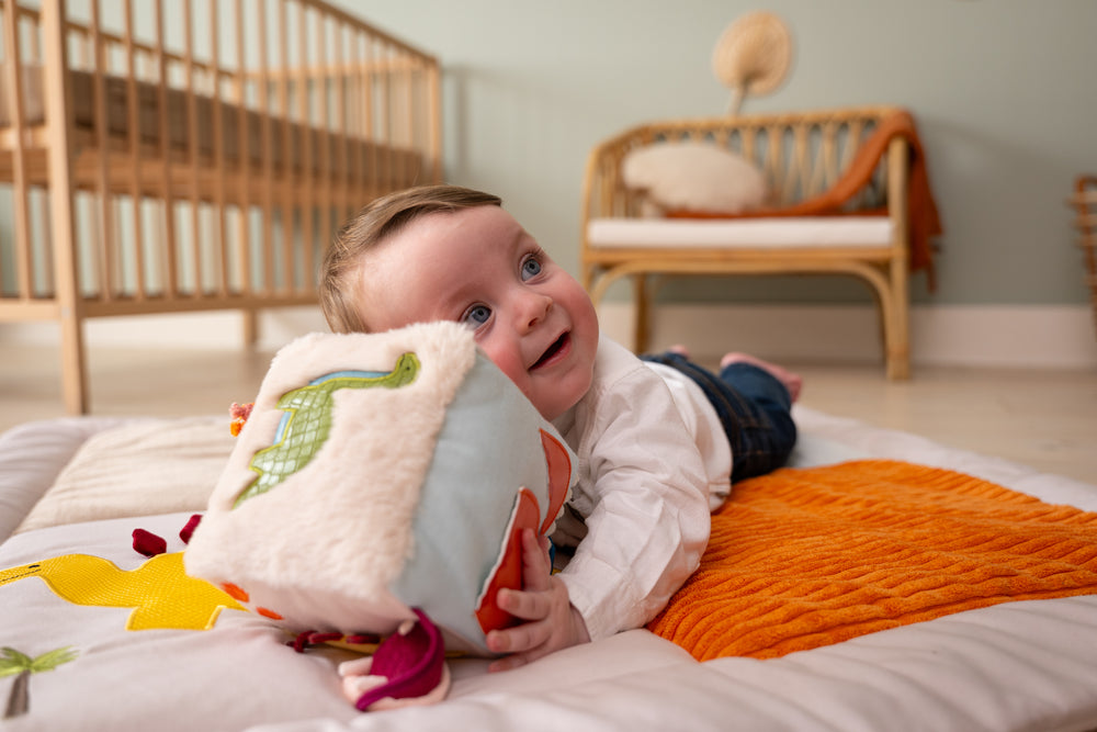 Roar-some sensory surprise – Each cube side hides a new tactile delight—crinkly fabric, a soft rattle, a mirror to discover their own reflection, embroidered dinos, and teething rings to explore.