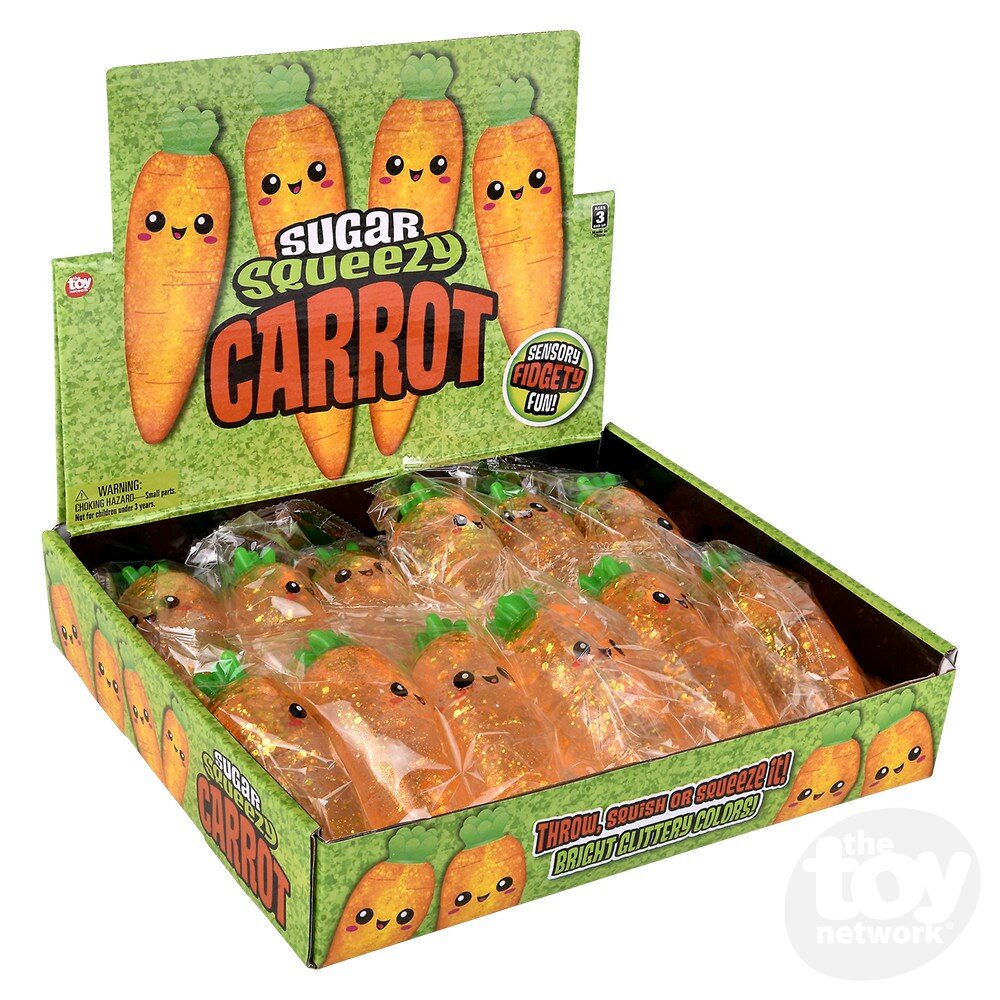 The Toy Network's Squeezy Sugar Carrot 5" is a carrot-inspired sugar ball great for stress relief and fidgeting. Perfect for holiday baskets.
