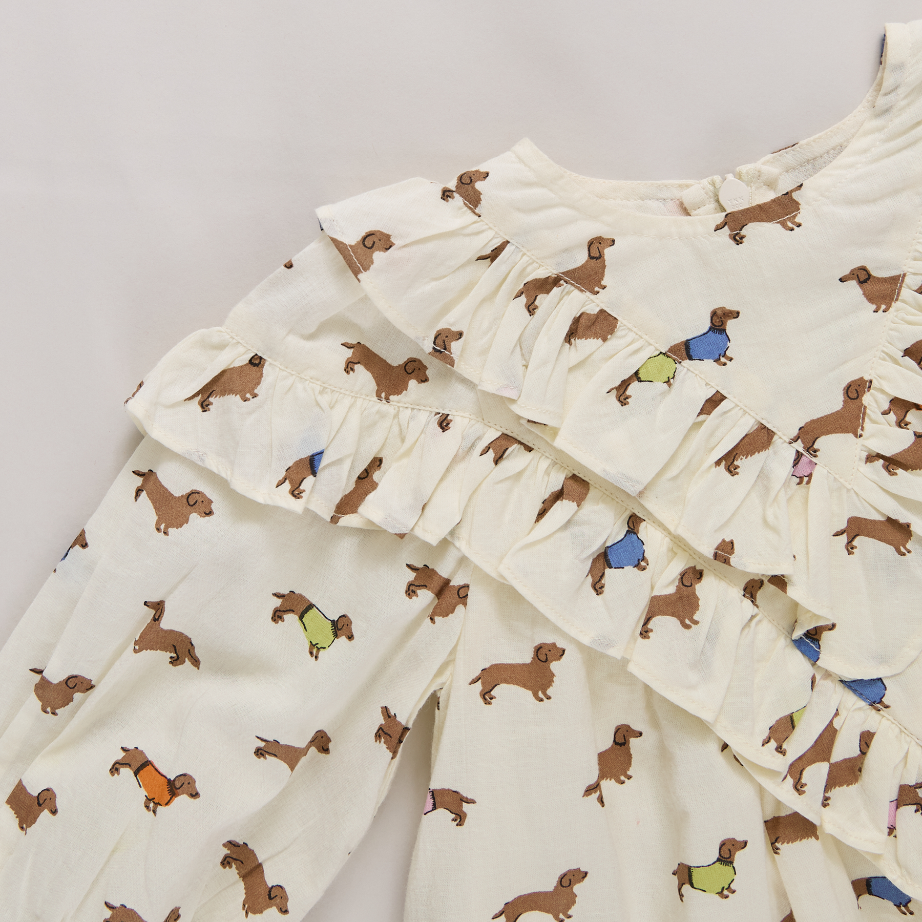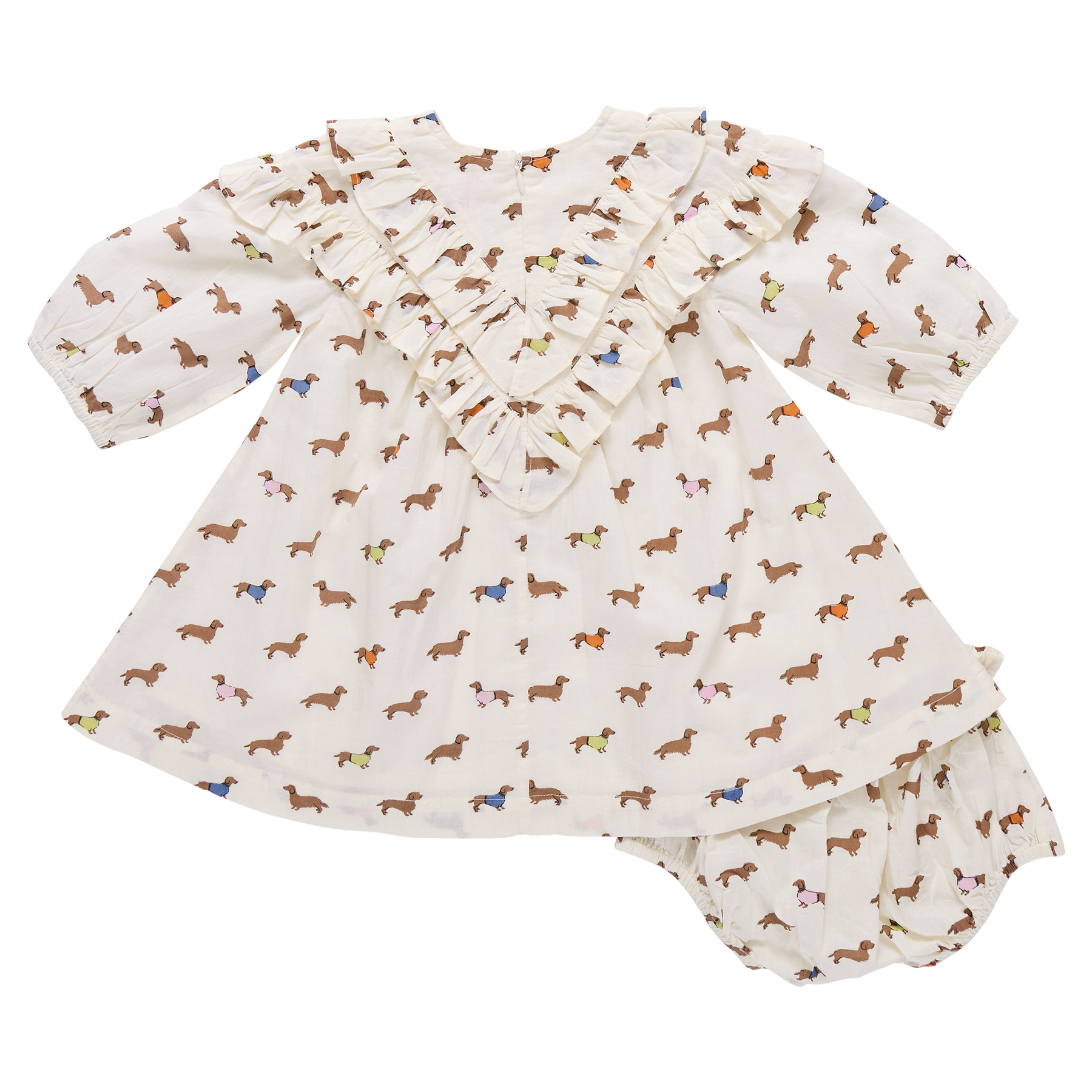 A brand new favorite full of playful charm! This new silhouette features our dachshunds in sweaters print on soft 100% cotton cambric. Designed with long sleeves, a two tiered ruffle skirt, and a ruffle V neckline, the dress is finished with an invisible zipper for easy dressing. The matching diaper cover features a blue satin bow for a sweet coordinating touch.