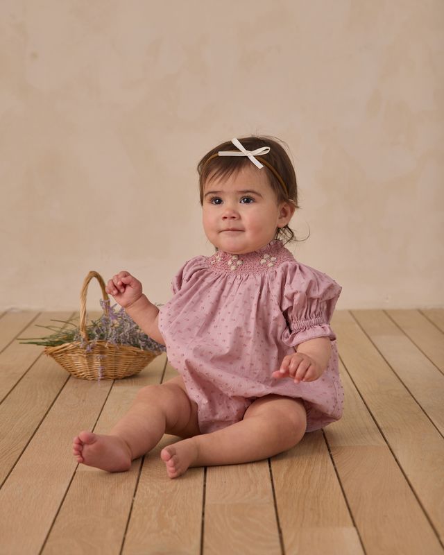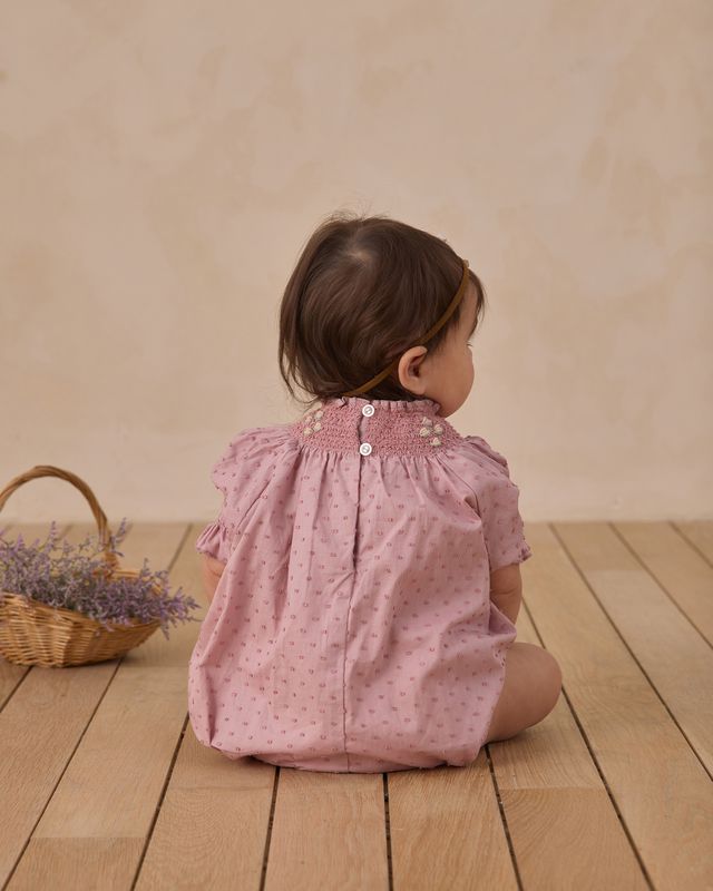 A smocked neckline with simple floral embroidery adorns this vintage inspired romper made from our swiss dot textured fabric.