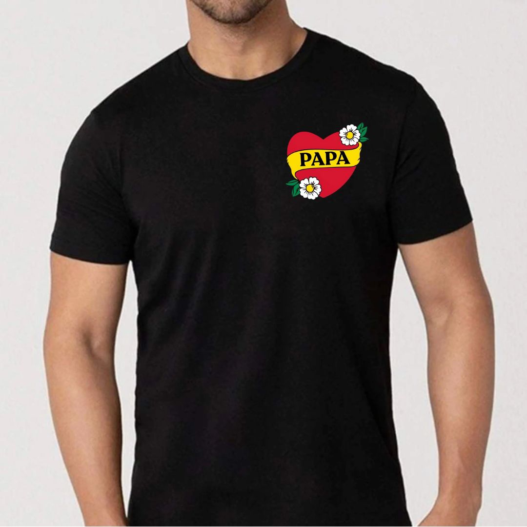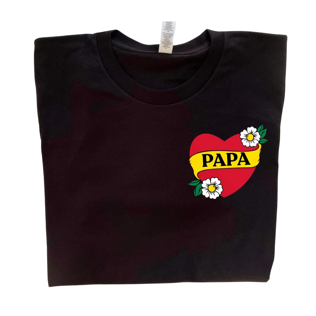 Heart-of-Gold Dad Vibes – bold heart and “Papa” text on a soft black tee makes dad pride easy to wear and impossible to miss.