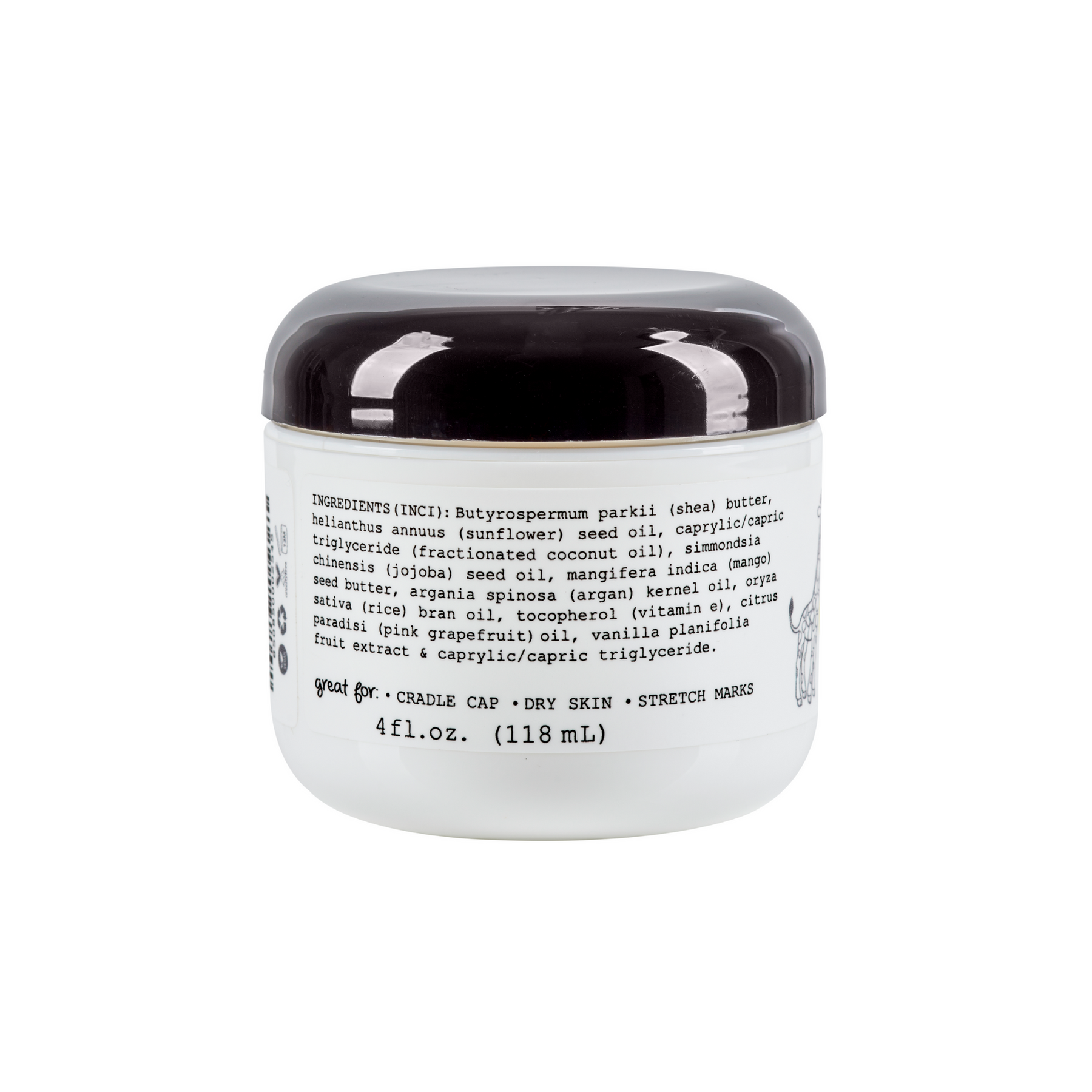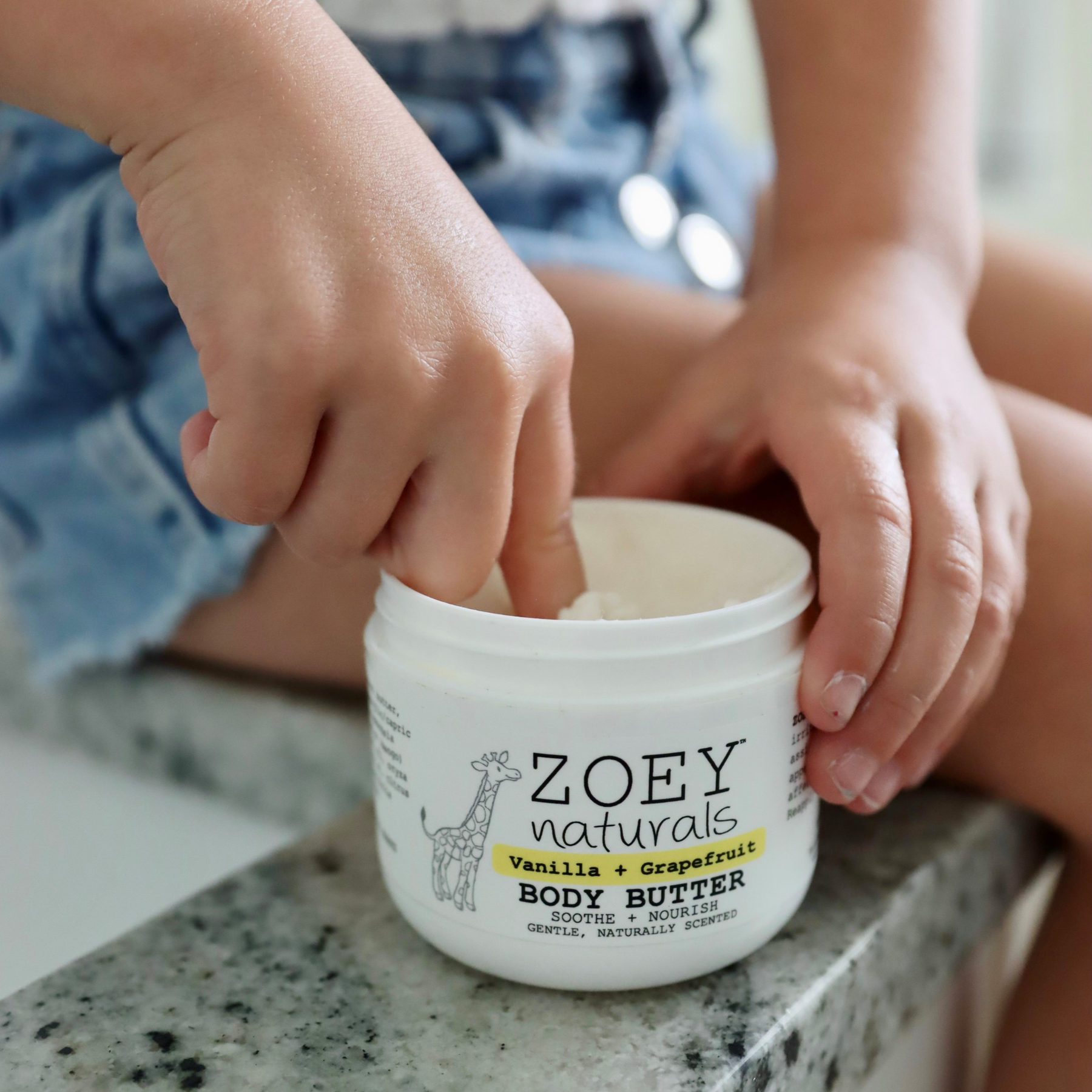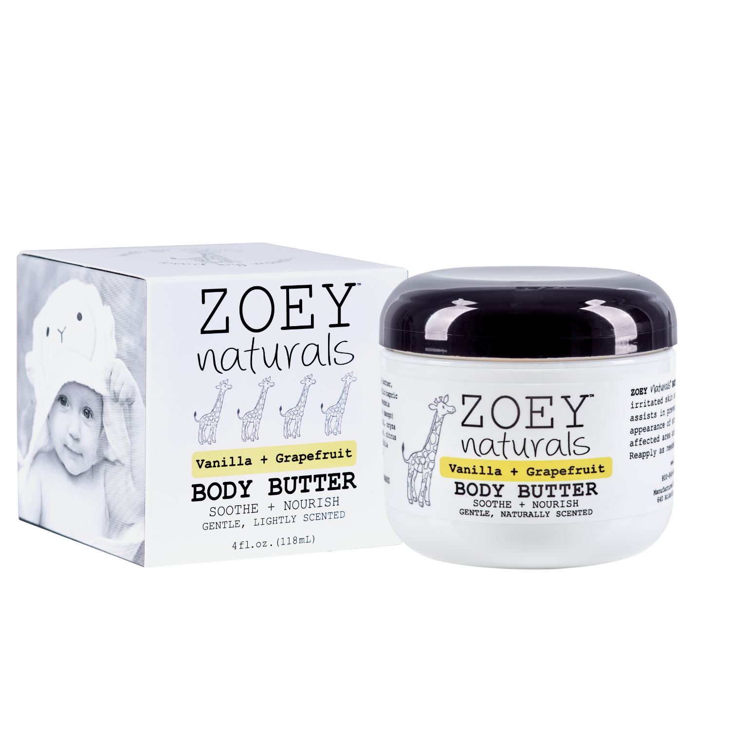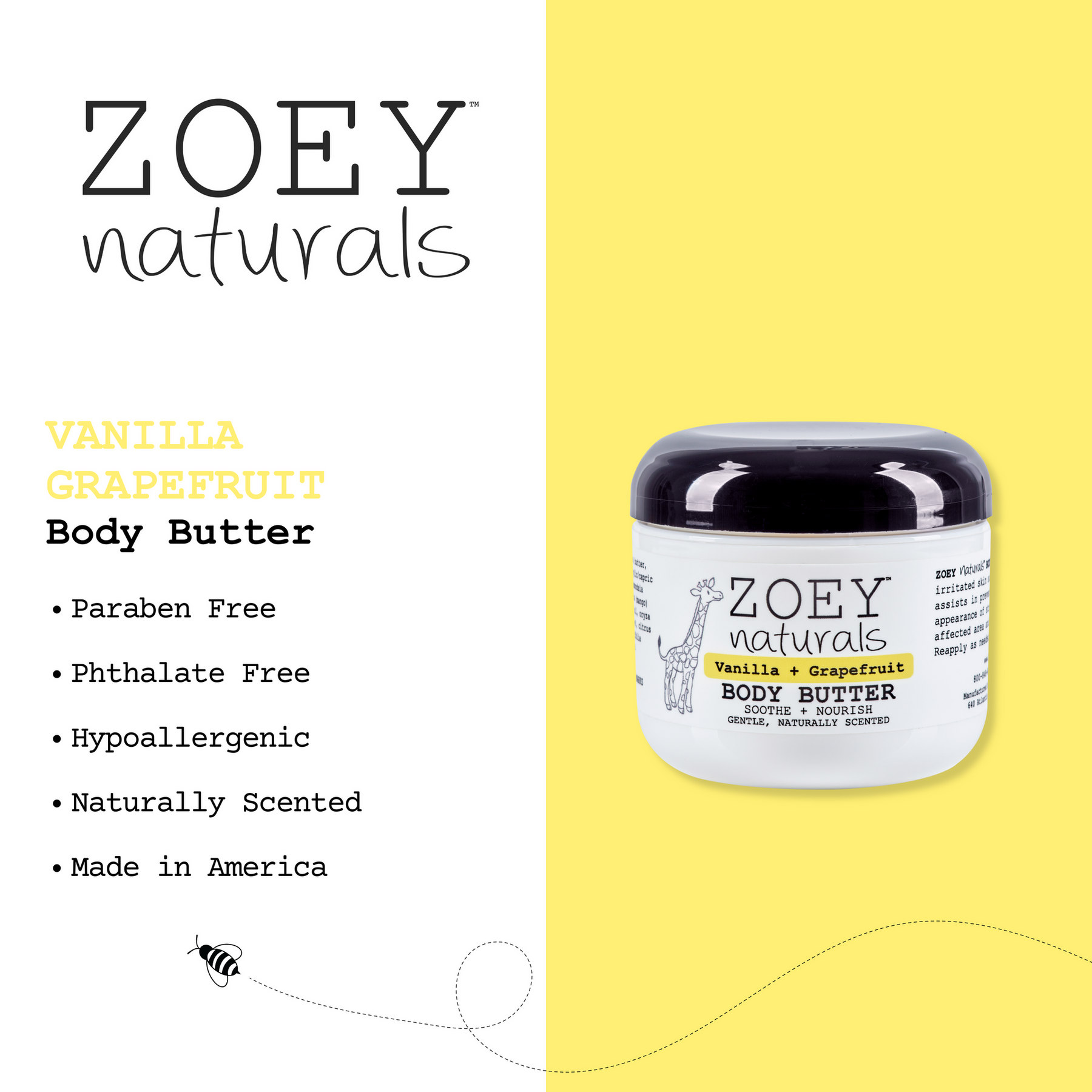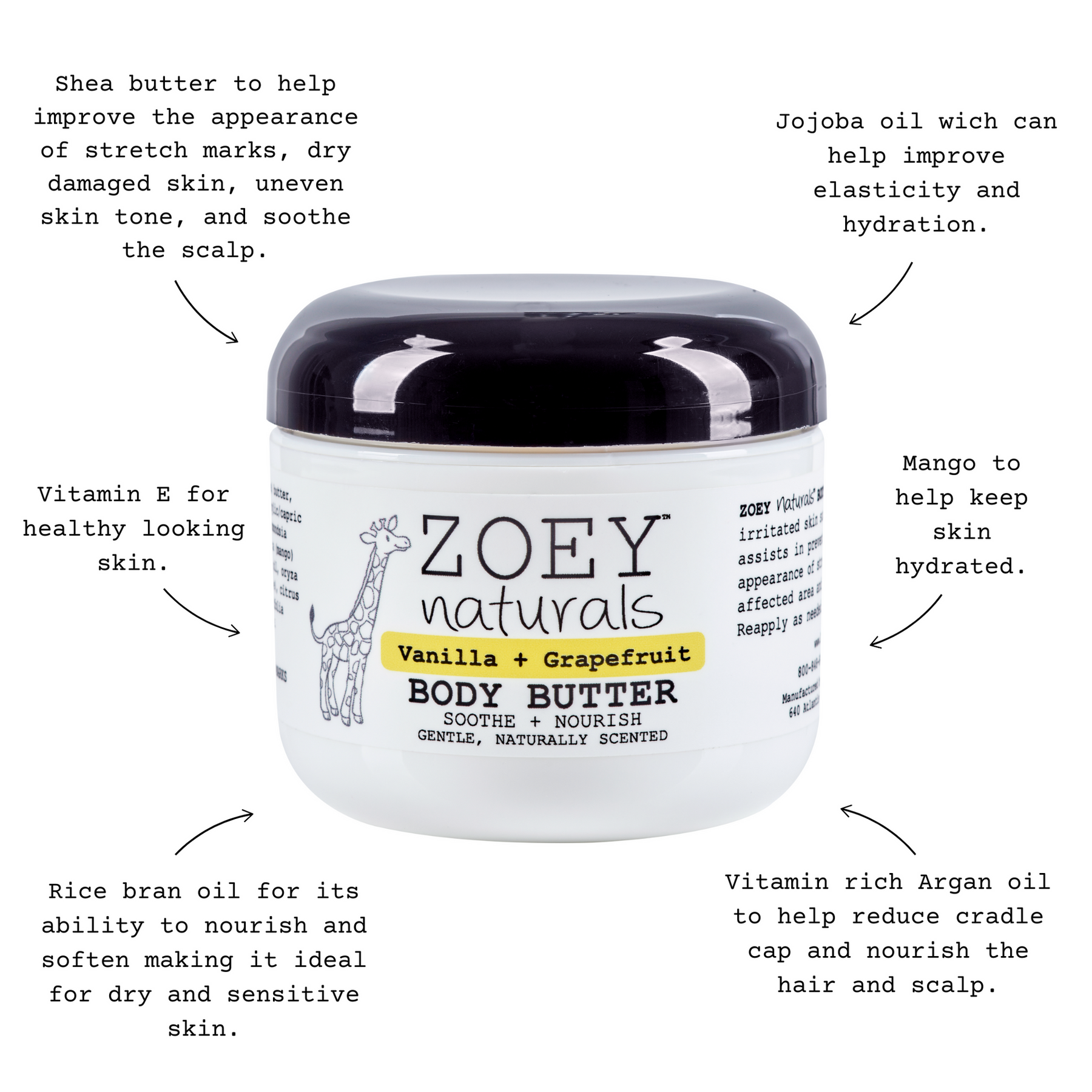 Soothe and nourish dry skin with Zoey Natural's Vanilla Grapefruit Body Butter. This magical shea butter blend works wonders to help alleviate symptoms associated with cradle cap, assist in minimizing the appearance of stretch marks, help increase skin elasticity, and increase moisture. Naturally scented with sweet, dreamy notes of vanilla and refreshing pink grapefruit. Paraben-free, phthalate-free, cruelty-free, and vegan.