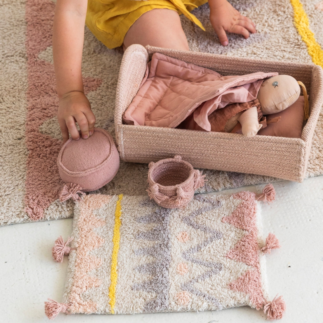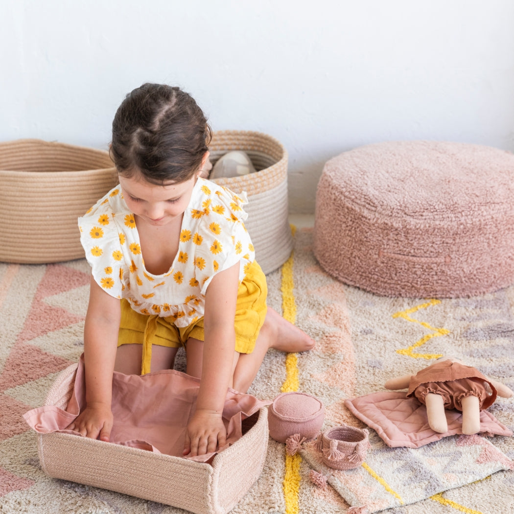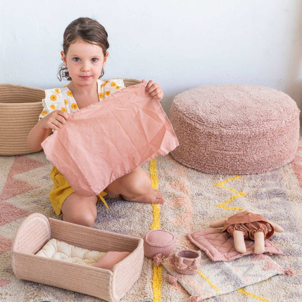 A textile toy set including a soft doll, a crib with bedlinen and matching decoration consisting of a rug, a pouf and a basket. The doll and the bedset is made using GOTS certified soft cotton poplin, the cotton mattress is filled with RugCycled fibers, and the crib is made of braided cotton ropes mixed with fibers from recycled PET-bottles. The decoration articles are a tribute to the Lorena Canals bestselling designs Azteca rug, Tassels basket and Chill pouf. Comes packed in a recycled cardboard box shaped as a house, with a practical multicolor cord as a handle.