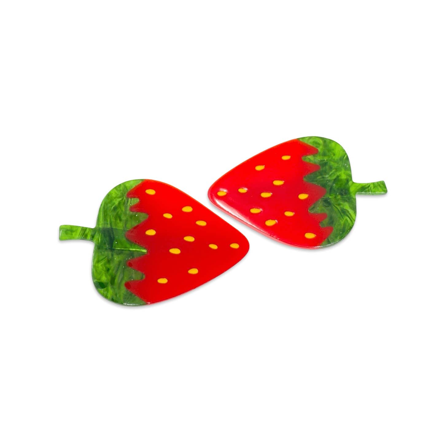 Double the sweetness with Jenny Lemons' strawberries alligator clip set. This set of two clips is handmade from eco-friendly cellulose acetate and bursting with berry charm. Each one measures approximately 2.5" x 1.5" and adds a playful pop to any hairstyle. Perfect for fruit lovers, summer vibes, or anyone craving a cute and sustainable accessory.