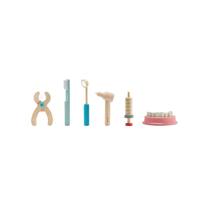 - The set includes 1 plier, 1 tooth mirror, 1 dental drill, 1 toothbrush, 1 full set of teeth with 3 spare, 1 dental gum model, 1 syringe, 1 bag