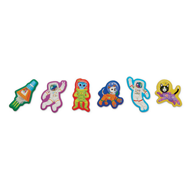 - Includes magnetic fold-up game board with built-in spinner, 6 magnetic space-explorer game pieces