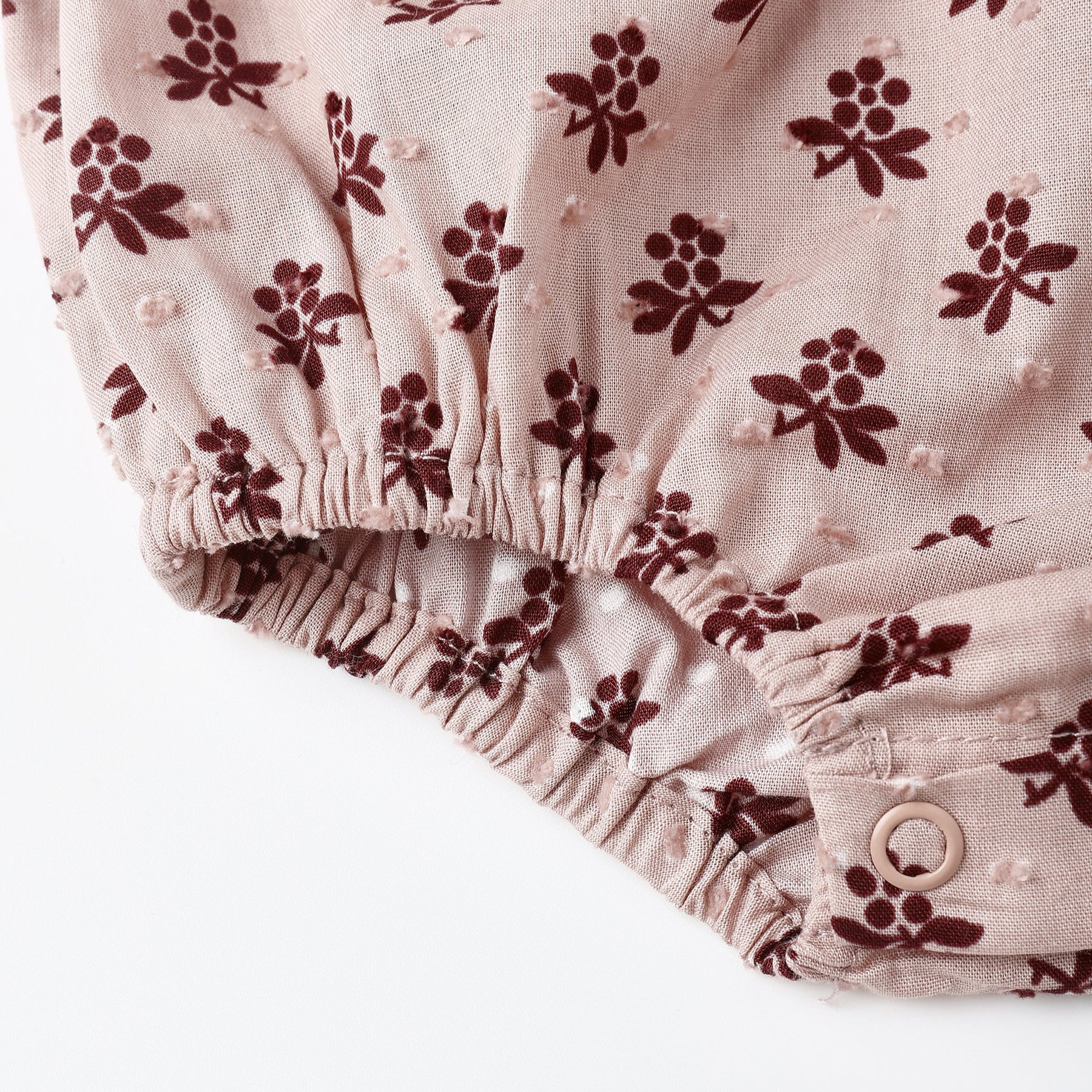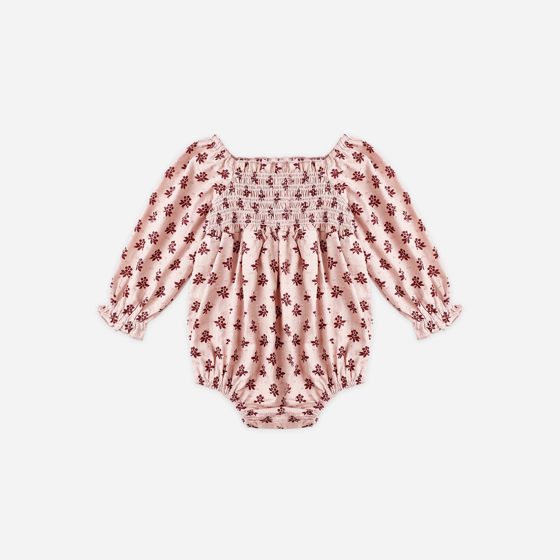 The Rylee + Cru Adelaide Romper features a delicate square neckline, smocked detailing at the front and back, long puffed sleeves, and convenient bottom snaps for easy changes.