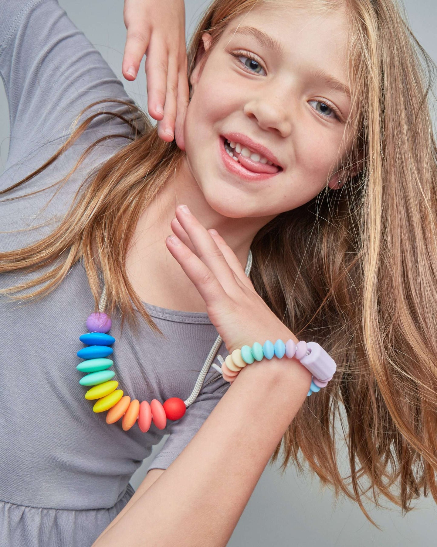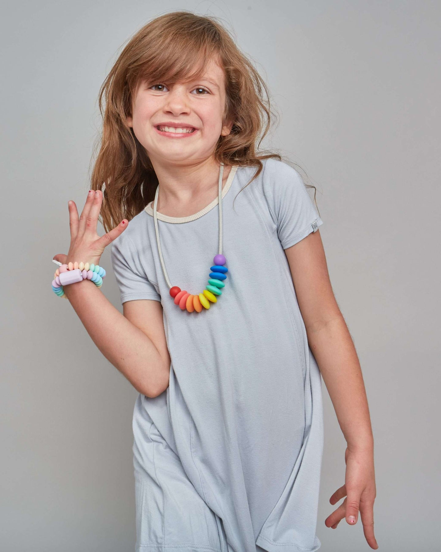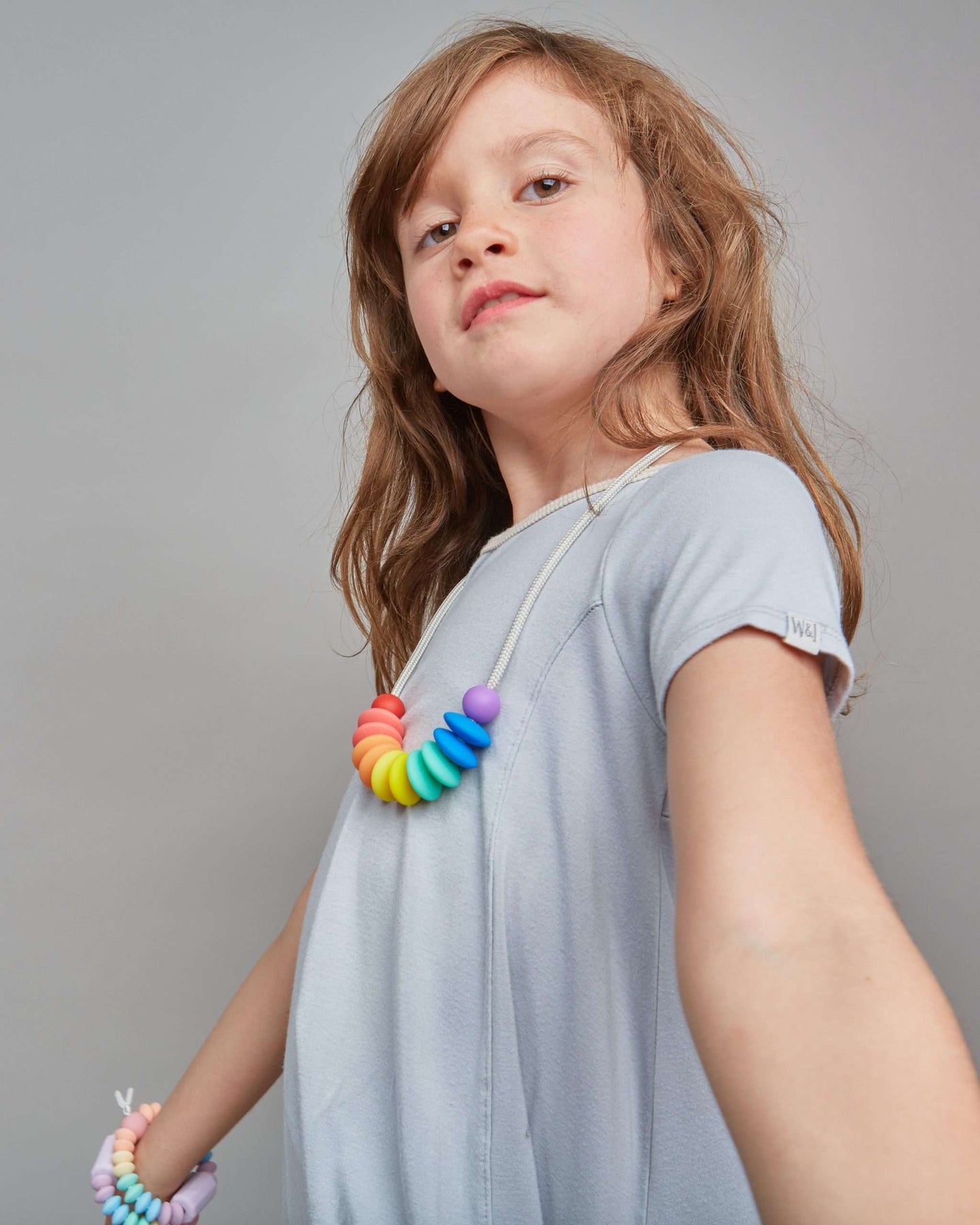 Rock the rainbow and show your colors! January Moon's Kaleidoscope Sensory Necklace offers comfort to school-aged kiddos when they need it most. January Moon's Sensory Collection is perfect for soothing tender gums, calming anxiety, or providing input for littles with SPD. See product details below.