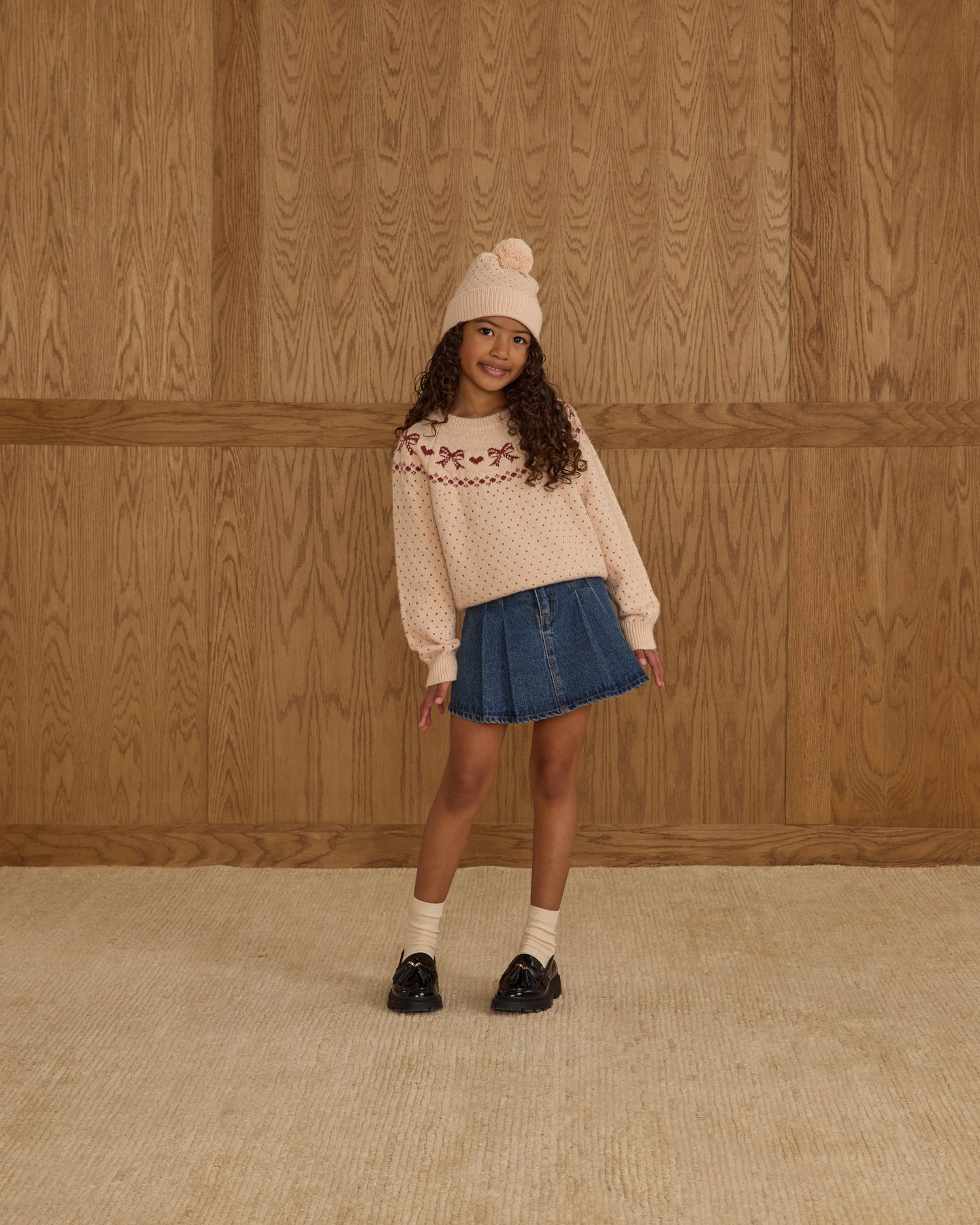 This Fair Isle Sweater is a cozy knit featuring a sweet bow motif and traditional fair isle patterning. Designed in a soft petal base with warm accents, it brings both comfort and charm to everyday wear.