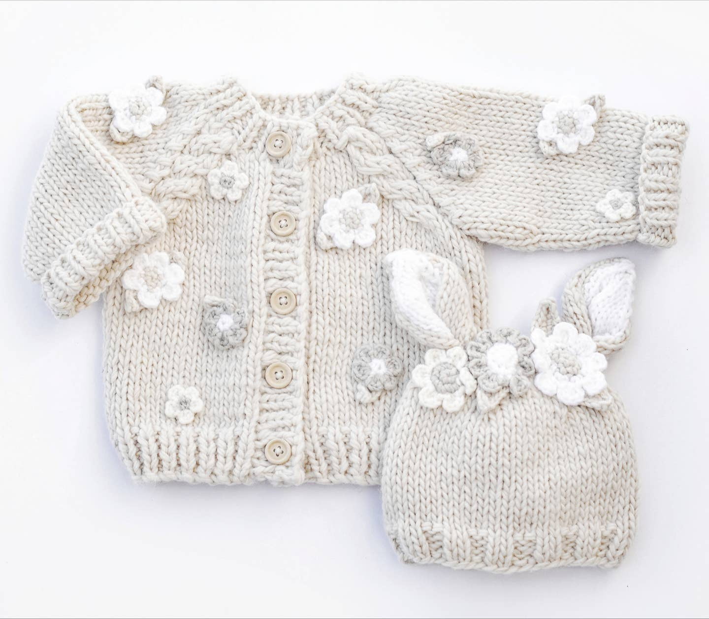 This Natural hued cardigan features hand-knit detailing and natural wood buttons. Not only is it adorned with beautiful crocheted flowers, but the raglan sleeves also have cable knit accents. Add matching Flower Bunny Beanie for a cute and cozy look.