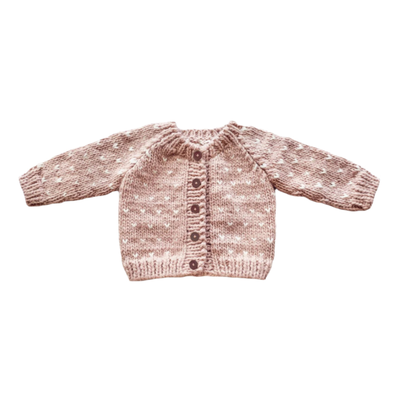 Featuring a gentle blush base, this cardigan's welcoming tiny cream hearts will have your little one feeling like they're wrapped in your love. Don't forget the matching hat and mittens.