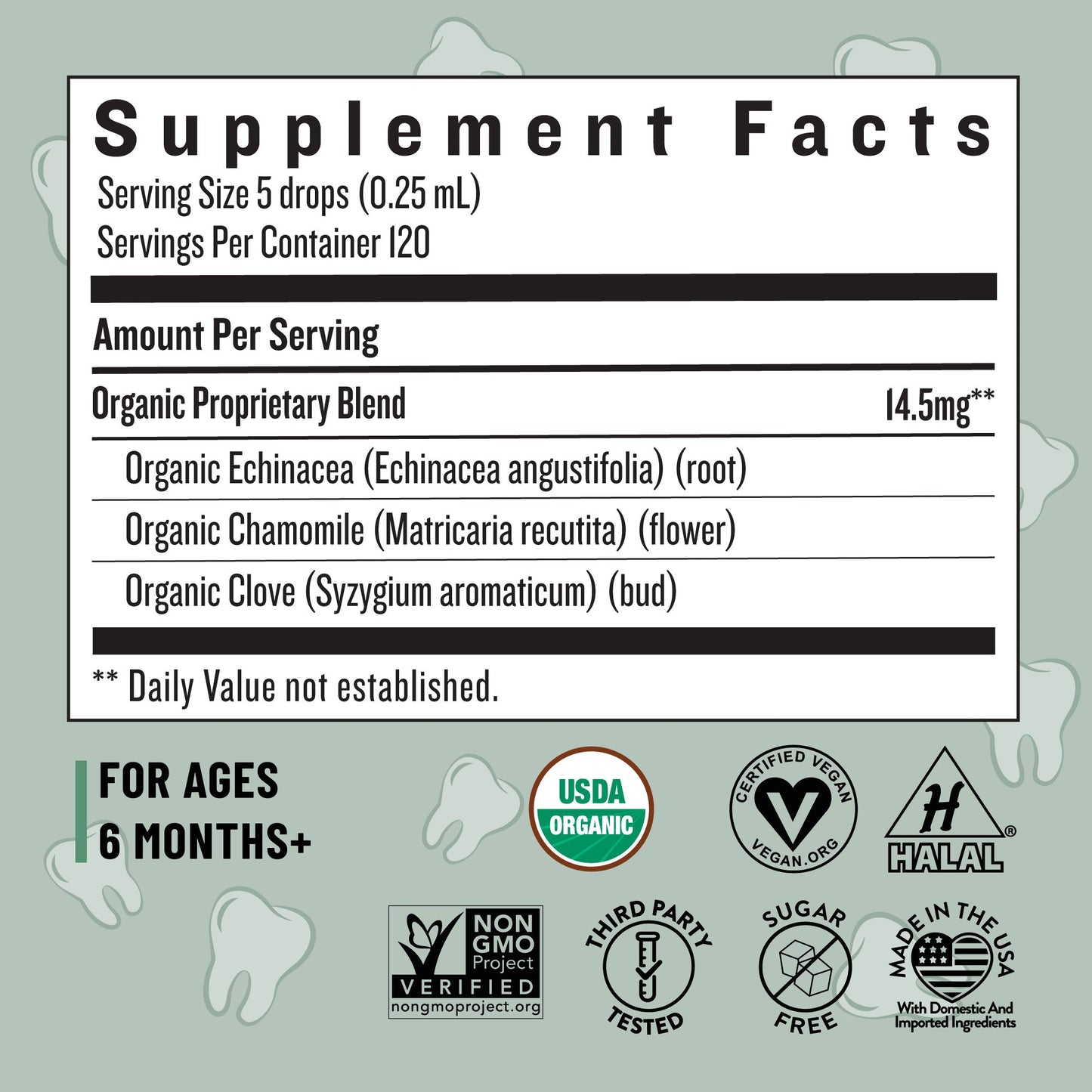 - Organic Echinacea (Echinacea angustifolia) (root), Organic Chamomile (Matricaria recutita) (flower), Organic Clove (Syzgium aromaticum) (bud)
