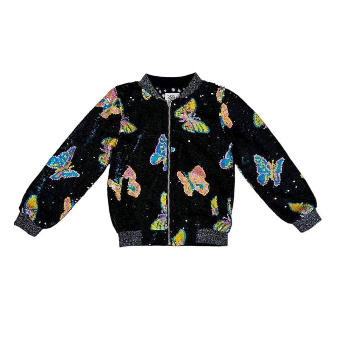 Dazzling black bomber jacket adorned with colorful sequin butterflies for a bold and magical look. Features a full front zip closure, ribbed cuffs, and hem for a secure and stylish fit. Perfect statement piece to add sparkle and personality to any outfit, day or night.